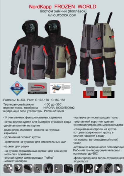 Костюм-поплавок Nordkapp Frozen World зимний. В костюме использованы вставки из вспененного полиэтилена, который помогает человеку удерживаться на воде некоторое время Использование спасжилета - обязательно для собственно безопасности. Куртка и полукомбенизон: флис в отделке карманов для обеспечения комфорта в зимнюю погоду, фольгированное волокно обеспечивает сохранение тепла - эффект отражение тепла внутрь. вставки из всепененного полиэтилена в области колен, спины куртки, специальные стропы для удержания куртки при возможном падении в воду, ветрозащи поясная, манжеты на куртке выполнены из неопрена, множество функциональных карманов, водонепроницаемые молнии, ветро- и снегозащитный чехол от колена на штанин, сетка в подкладе для быстрого вытекания воды из костюма после погружения в воду, специальное отделение на рукавах для спасательных шил, отстегивающийся регулируемый утепленный капюшон с гибкой вставкой, 14 утепленных карманов различного объема, в том числе карманы специального назначения: карман на рукаве для хранения прикормки или мотыля, карман для рации или телефона, карман клапан для шумовки. Цвет: серый с черными и красными вставками. Температурный режим: -10/-35. Мембрана: Hipora 10000 мм /8000 гр./м?/24ч. Утеплитель: PRIMALOFT SILVER.