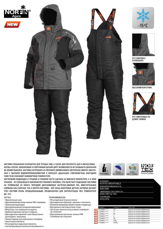 Костюм зимний Norfin Apex -  специально разработан для теплых зим, а также для эксплуатации в межсезонье – весны и осени. Лаконичный и спортивный дизайн даёт возможность не сковывать движения во время рыбалки. Костюм изготовлен из прочного мембранного материала Nor-Tex Breathable с высокой водонепроницаемостью и хорошей «дышащей» способностью, благодаря чему тело сохраняет комфортную температуру. Внутренняя подкладка в грудной и спинной части сделана из мягкого полиэстера, а в зоне рукавов сделана из скользящего высококачественного нейлона, что облегчает надевание флисового термобелья под костюм.Передняя двухзамковая застёжка-молния YKK, объемные карманы как снаружи, так и внутри костюма – вот лишь некоторые детали, которые делают этот костюм очень функциональным. Предназначен для эксплуатации при температуре до -15°С.