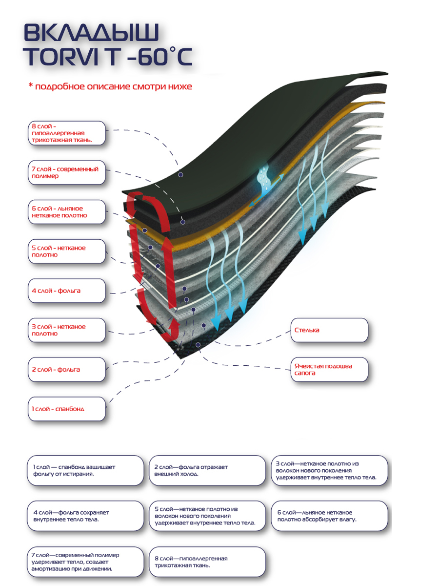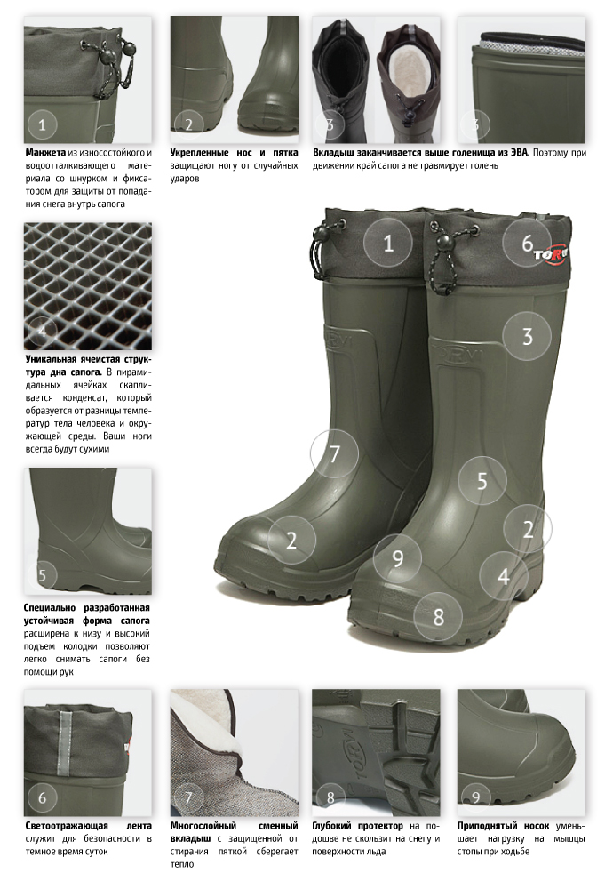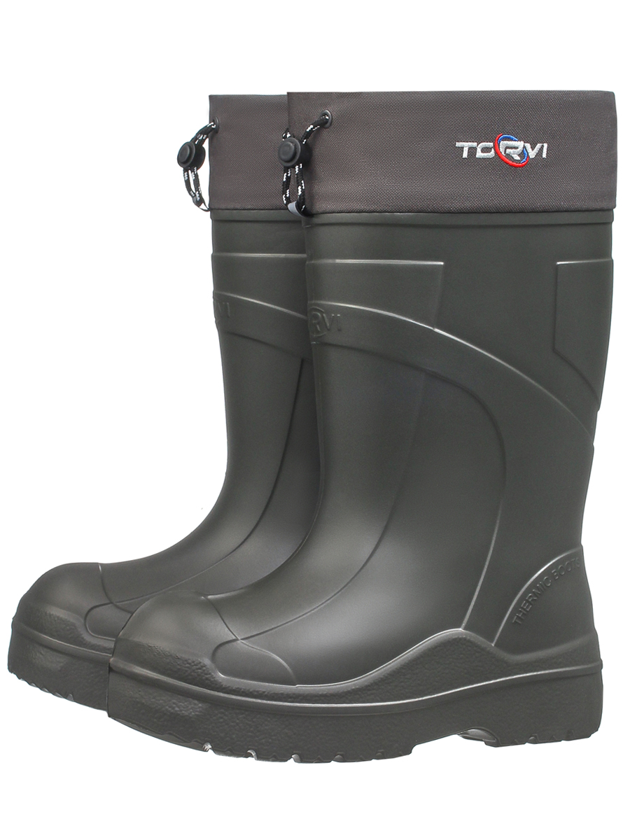 Сапоги из ЭВА TORVI -60 - созданы для использования в условиях сверхнизких отрицательных температур. Сапог цельнолитой ЭВА. Вкладыш 7 - слойный теплый сэндвич системы Arctivic Температура использования до -60 градусов Цельсия. Манжета из износостойкого и водоотталкивающего материала со шнурком и фиксатором для защиты от попадания снега внутрь сапога. Укрепленные нос и пятка защищают ногу от случайных ударов. Вкладыш заканчивается выше голенища и при движении край сапога не травмирует голень. Уникальная ячеистая структура дна сапога, где скапливается конденсат. Ваши ноги всегда будут сухими. Устойчивая форма сапога расширена к низу, высокий подъем колодки позволяют легко снимать сапоги без помощи рук. Глубокий протектор на подошве не скользит на снегу и поверхности льда. Приподнятый носок уменьшает нагрузку на мышцы стопы при ходьбе. Средняя высота пары- 41 см. Средний вес пары 850г.