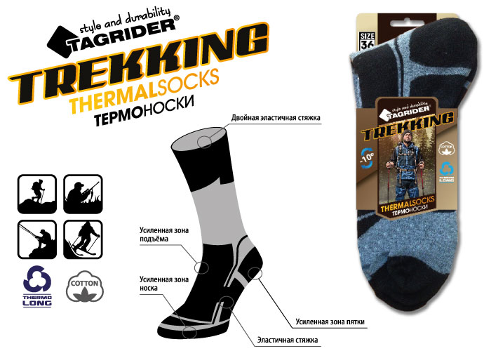 Термоноски Tagrider предназначены для повседневной носки, туризма, охоты и рыбалки в холодную погоду. Шерсть овец-мериносов (Merino Wоо|) отлично сохраняет тепло, впитывает влагу и поглощает запах. Входящий в состав ткани модифицированный полипропилен (PPmod) увеличивает срок службы носков, отлично выводит влагу, сохраняет первоначальную структуру ткани и позволяет носкам быстро сохнуть. Волокна этой ткани производятся по специальной технологии, придающей им структуру капилляров. Мельчайшие капилляры - волокна ThermoLong эффективно отводят влагу, сохраняя комфортный микроклимат. Многозональная структура вязки, выполненная с учётом анатомических особенностей ноги, обеспечивает дополнительный комфорт и защиту при носке. Гиппоаллергенны. Состав: 18% шерсть, 35% хлопок, 35% дакрон, 2% нейлон.