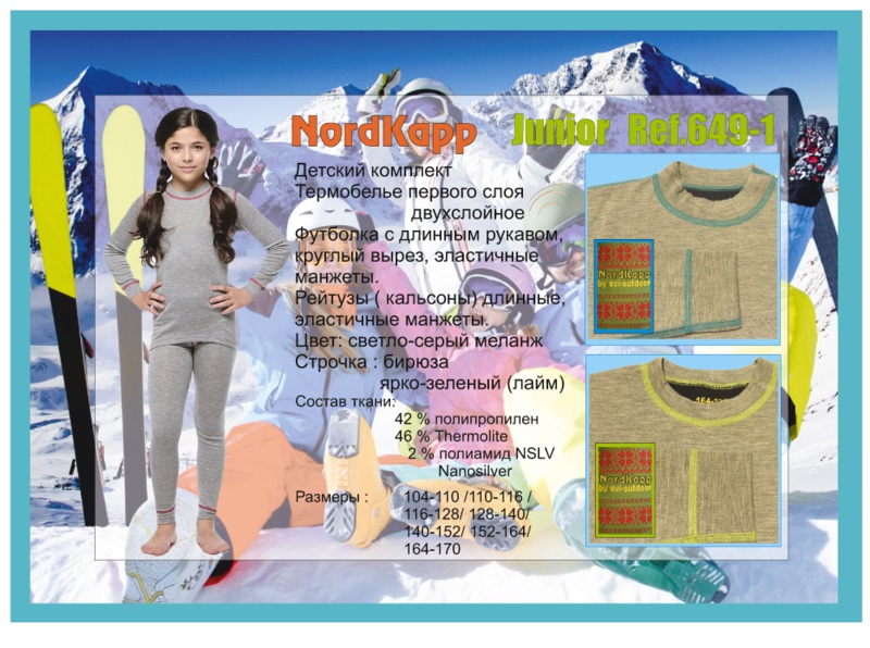 Детское термобелье NordKapp SAMPO. Универсальное детское термобельё. Предназначено для высокой активности в холодных погодных условиях. Состав: Thermolite-46%. Полипропилен-52%. Nanosilver(антибактериальная обработка)-2%. Nanosilver (Polyamide NSLV)- антибактериальная обработка микроволокна серебром кардинально отличается от традиционных методов добавления серебра в ткань и основана на пропитке ткани ионами серебра. В отличие от технологии пропитки , когда ионы серебра наносятся на поверхность микроволокна и сравнительно быстро вымываются из ткани,технология Nanosilver обеспечивает присутствие нано-частиц серебра непосредственно в структуре полимера, из которого сделано микроволокно. Эти частицы невозможно удалить и они все время контактируют с поверхностью, нейтрализую процесс размножения бактерий. Thermolite - является лучшим изолятором и более эффективно поддерживает тепло, очень малый вес благодаря полой структуресохраняет тепло даже в намокшем состоянии, высыхает на 20% быстрее других изоляционных тканей и на 50% быстрее хлопка, за счёт мгновенного высыхания предотвращает озноб после занятий, хорошо стирается в машине и не даёт усадки после стирки. Thermolite был разработан и запатентован американской компанией INVISTA®, дочерним предприятием корпорации DuPont. Идею создания этого материала ученые позаимствовали у меха полярных медведей, волоски шерсти которых пронизаны пустотами. Благодаря такой оригинальной структуре волокон материал быстро отводит избыточную влагу от тела - на 20 % быстрее, чем другие материалы, на 50 % быстрее, чем хлопок. Материал обладает свойством сохранения тепла, при этом влага выводится через ткань в ее внешние слои, где хорошо испаряется. Это сводит опасность переохлаждения тела к минимуму. Ткань имеет высокие изоляционные свойства и сохраняет свои свойства при намокании.Даже когда ткань намокает, она не теряет своих уникальных свойств. Создается эффект термоса, т. е. материал сохраняет температуру тела. Вместе с шерстью мериносов Thermolite создает оптимальную для организма терморегуляцию. Это особенно важно при частой смене режима двигательной активности и/или внешних условий.Также волокна не впитывают запахи и препятствуют размножению на них микроорганизмов, не «садятся» и хорошо держат форму. Еще одним достоинством утеплителя Thermolite является гипоаллергенность. Thermolite® мгновенно высыхает и эффективно сохраняет необходимый температурный режим. Thermolite® быстро реагирует на изменения температуры тела и предотвращает перегрев или переохлаждение человека. Другими словами, Thermolite® является своего рода «температурным контролёром» своего владельца.Секрет такого замечательного поведения заключается в использовании особых волокон, имеющих полую структуру. Как работает термобелье? Содержащийся в термобелье воздух, соприкасаясь с телом, нагревается до комфортной температуры. Таким образом, создается защитная прослойка из теплого воздуха между кожей и холодной внешней средой, получается эффект сохранения тепла. При интенсивной физической нагрузке кожа человека выделяет влагу (пот), которая, накапливаясь в ткани обычного белья, снижает его теплоизоляционные свойства. На согревание и испарение этой влаги расходуется дополнительная энергия. Функциональное термобелье отводит влагу от тела. Защитная прослойка из теплого воздуха между