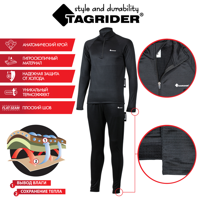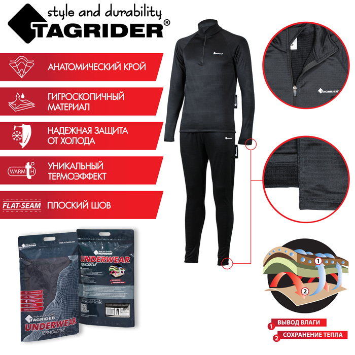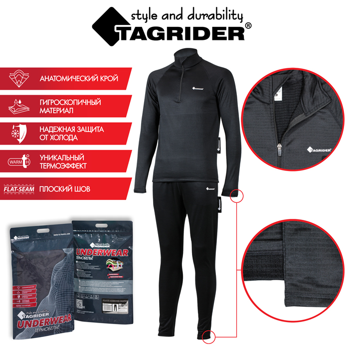 Термобелье Black Armour от компании Tagrider. Современное термобелье анатомического кроя с плоскими швами, выполнено из гигроскопичных материалов. Обладает уникальным термоэффектом, надежно защищает от холода. Используемые материалы обеспечивают быстрый вывод влаги, комфорт во всех режимах активной деятельности. Термобелье Black Armour - сохраняет оптимальную температуру тела, тонизирует, снимает напряжение мышц.