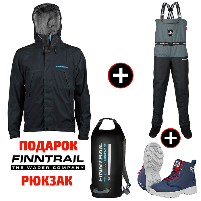 Комплект забродной экипировки Finntrail Wademan-Airman-Urban включает в себя: Вейдерсы финские Finntrail Wademan 1524 Grey, Забродная куртка Finntrail Airman 6420 Max, Ботинки для вейдерсов Finntrail Urban 5090 Light Blue. При покупке данного комплекта вы получаете Герморюкзак Finntrail Target 20L 1716 стоимостью 2090 руб. абсолютно бесплатно! Вейдерсы финские Finntrail Wademan 1524 Grey: Облегченные вейдерсы для тех, кто предпочитает комфорт. У Wademan минимальное количество швов, особенно во внутренней области ног. Многим знакомо, что вейдерсы по мере износа начинают протекать по швам, меньше швов — выше надежность. Нижняя часть вейдерсов (до пояса) выполнена из прочной четырехслойной ткани с мембраной «HARD-TEX», верх — из облегченной ткани. Вейдерсы оснащены двумя карманами с защитой от воды, анатомическим кроем, D-образными петлями, петлями для просушки, эластичными подтяжками и ремнем с логотипами Finntrail на замке YKK. В комплекте гермочехол для смартфона и документов, а также удобная сумка для хранения и переноски. Характеристики: Износостойкая четырехслойная ткань с мембраной «HARD-TEX». Усиление ниже пояса. Высокая водонепроницаемость 20 000 мм. Дышащая способность 7000г./м2/24ч. Грязеотталкивающее покрытие TEFLON. Эластичные подтяжки и ремень с логотипами Finntrail на замке YKK. Вместительный влагозащитный нагрудный карман. Дополнительный выкидной карман. Петли для просушки. Надежные неопреновые носки толщиной 4 мм с усилением на подошве. В комплекте гермочехол для смартфона и документов. Ботинки для вейдерсов Finntrail Urban 5090 Light Blue: Новые ботинки выполнены в городском стиле. Легкие и максимально удобные. Сделаны из высококачественного износостойкого материала с плетением Oxford. Обеспечивают надежную поддержку голеностопа. Ботинки оснащены новой подошвой из прочной резины для наилучшего сцепления с любой поверхностью. Между элементами протектора на подошве не задерживается песок и грязь. Лучшее на рынке сочетание цены и качества. Больше нет необходимости искать альтернативную обувь для вейдерсов. Характеристики: Легкий вес. Мягкие и удобные. Износостойкий материал с плетением Oxford. Сверхустойчивая подошва из прочной резины. Грязевой протектор. Надежная поддержка голеностоп. Прочные нейлоновые шнурки. Выпускаются в размерах 39-47.Забродная куртка Finntrail Airman 6420 Max: Легкая куртка для вейдерсов выполнена из прочной мембранной ткани «HARD-TEX», тем самым достигнут наивысший уровень комфорта для передвижения. Сетчатая подкладка обеспечивает проветривание и дополнительный комфорт. Куртка с двумя внешними карманами на молниях, с защитным клапаном и одним внутренним карманом. С помощью регулируемых манжет на липучках легко зафиксировать рукав. Отсутствие швов на плечах продлевает срок службы изделия. Куртка оснащена регулируемым капюшоном, кулисой для подгонки по фигуре. Характеристики. Трехслойная ткань с мембраной «HARD-TEX». Высокая водонепроницаемость 10 000 мм. Дышащая способность 7000г./м2/24ч. Грязеотталкивающее покрытие TEFLON. Внутренние манжеты с защитой от затекания воды в рукава. Два вместительных влагозащитных нагрудных кармана. Внутренний карман. Страховочные кольца для крепления чеки.