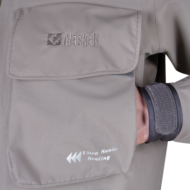 Куртка Alaskan River Master Sonic сделана с применением технологии «Ultra Sonic Sealing». Суть этой технологии в «сварных швах» без использования ниток. Куртка выполнена из 3-слойной современной мембранной ткани AERO-TEX. Куртка оснащена двумя объемными нагрудными карманами, которые можно использовать для обогрева рук и для хранения среднего размера коробки и подлесков. Воротник имеет микрофлисовую подкладку. Эргономичные рукава оформлены удобными манжетами. Забродная куртка Alaskan River Master Sonic отвечает всем требованиям рыболовов как по функциональности, так и по качеству и удобству. Особенности: Водонепроницаемость - 28000 mm (H?O). Дышащая способность - 12000 gr/m2/24h. Брызгозащитные молнии YKK с термоламинированием. Удобные регулировки капюшона по высоте и объему. Специальная водонепроницаемая регулируемая конструкция манжет. Множество функциональных карманов для коробок, подлесков и т.д.. Большие нагрудные карманы с быстросохнущей флисовой подкладкой также могут служить для обогрева рук. Ретриверы. Застежка-липучка «Velcro» на клапане нагрудного кармана. Внутренний непромокаемый карман для ключей или документов. Внутренний флисовый воротник.