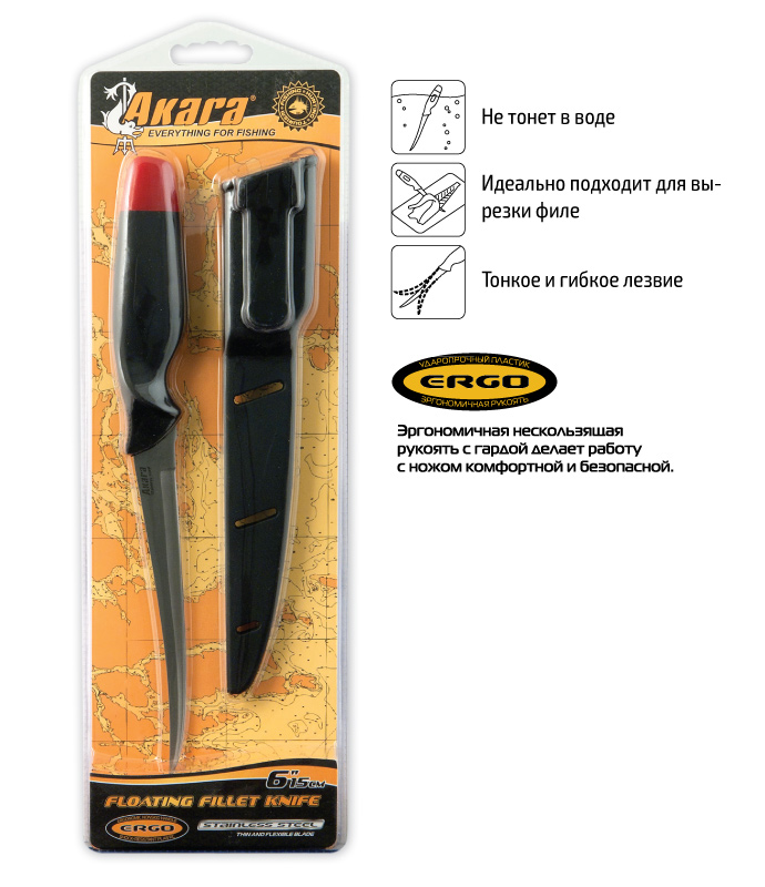 Филейный плавающий нож Akara Fillet Floating FK32 - идеально подходит для того, чтобы быстро и аккуратно вырезать филе или нарезать тонкие ломтики рыбы, или мяса. Не тонет в воде благодаря полой рукояти. Эргономичная нескользящая рукоять. Ударопрочный пластиковый чехол с клипсой для крепления на ремень. Лезвие из нержавеющей стали.