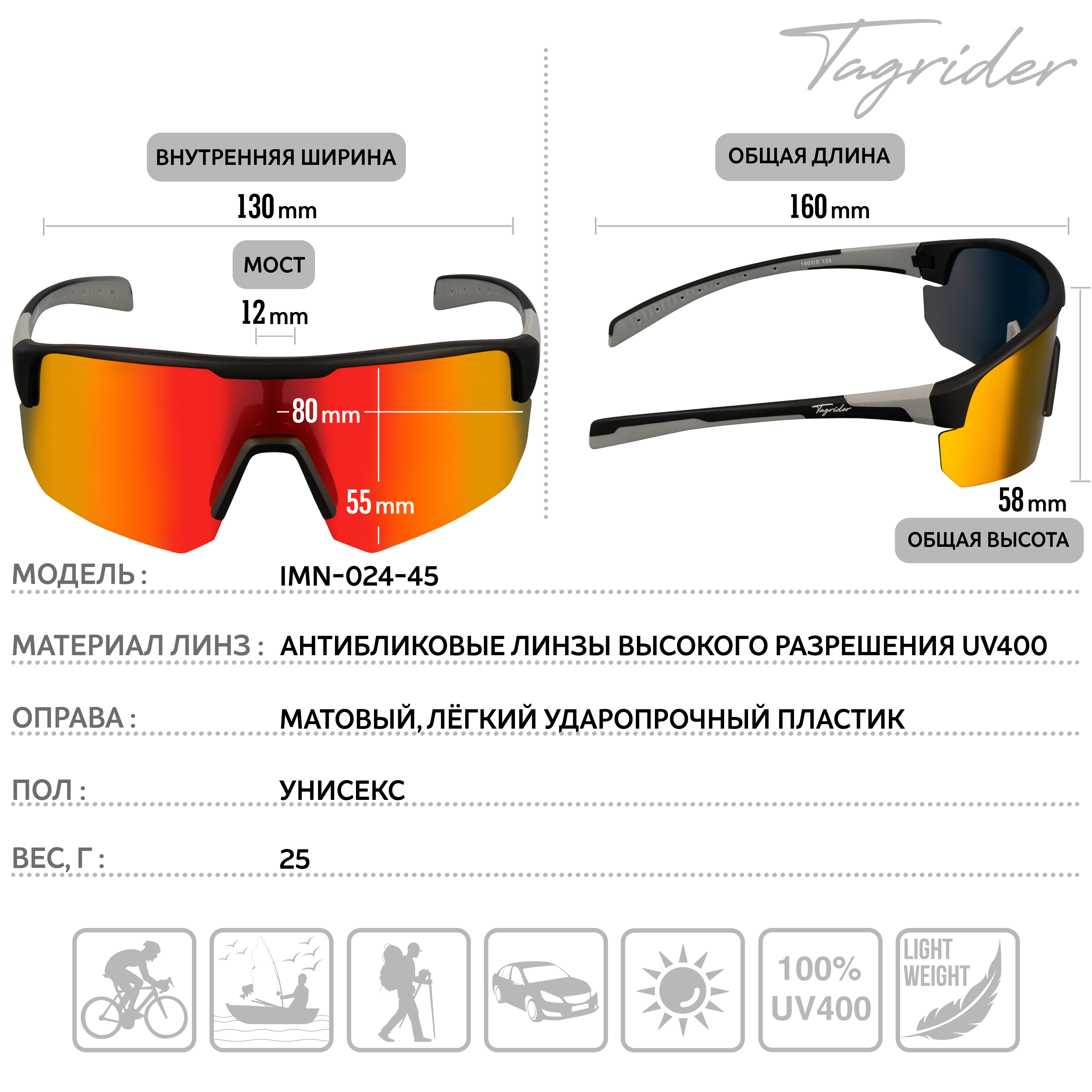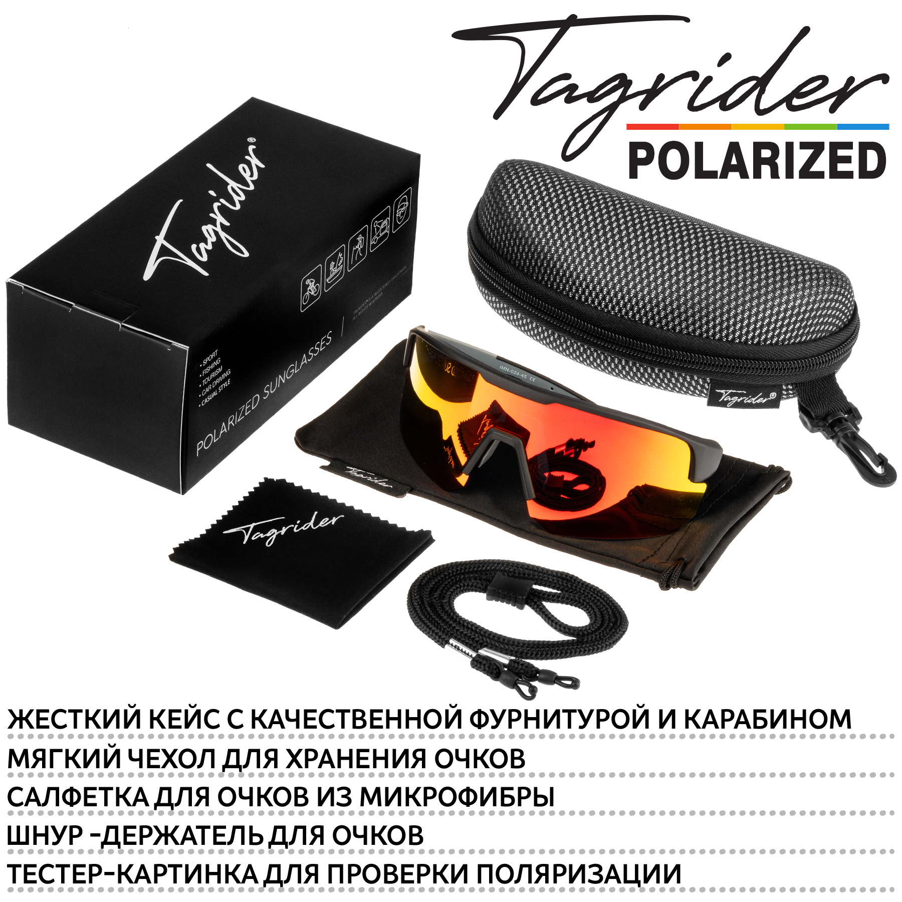 Tagrider IMN‑024‑45 — инструмент, который бережёт зрение так же уверенно, как качественный спасжилет бережёт жизнь: UV 400 и многослойная поляризация отвечают рекомендациям офтальмологов, а продуманный «полевой» набор аксессуаров делает очки готовыми к работе сразу «из коробки». Выберите Tagrider, если цените надёжную защиту и безупречный вид.