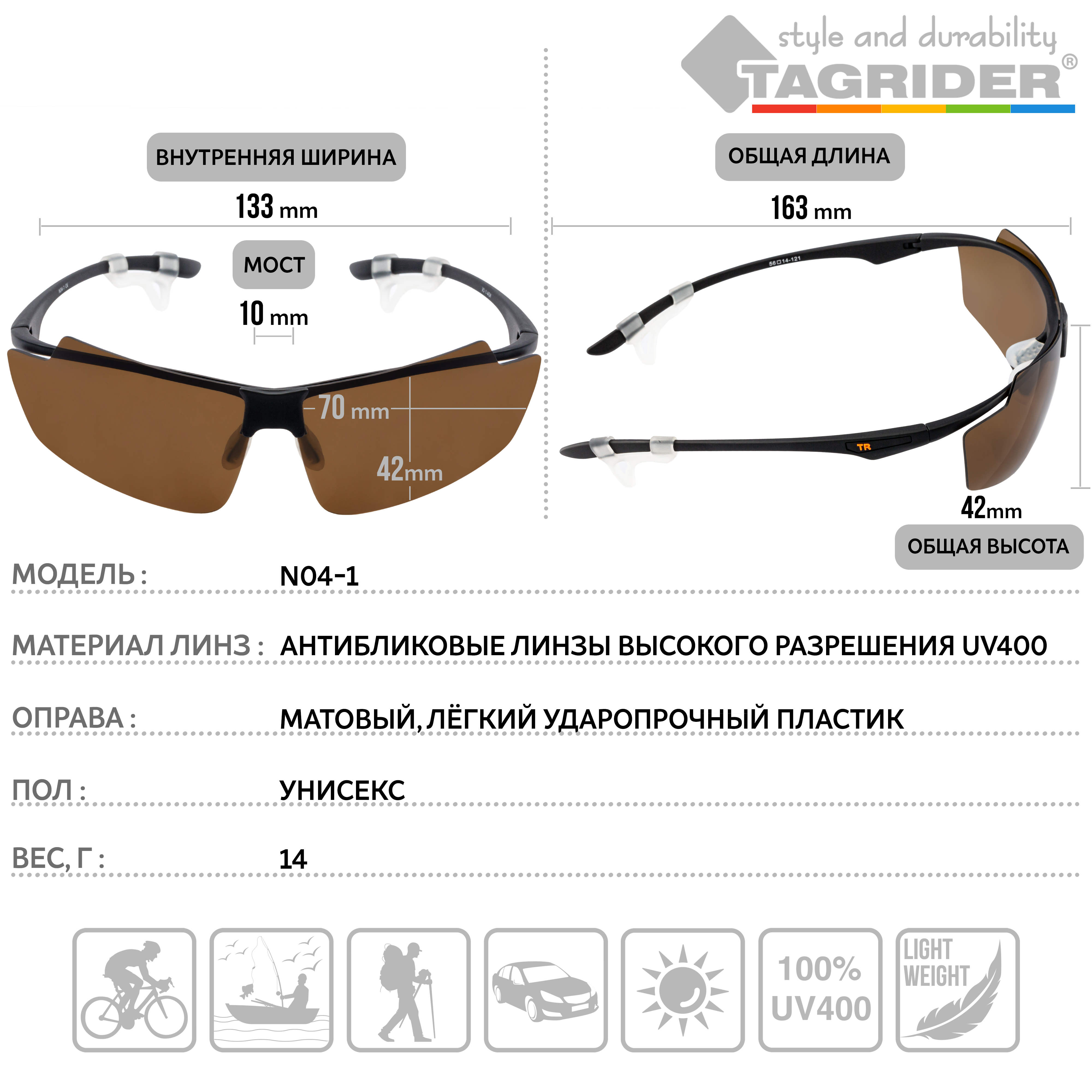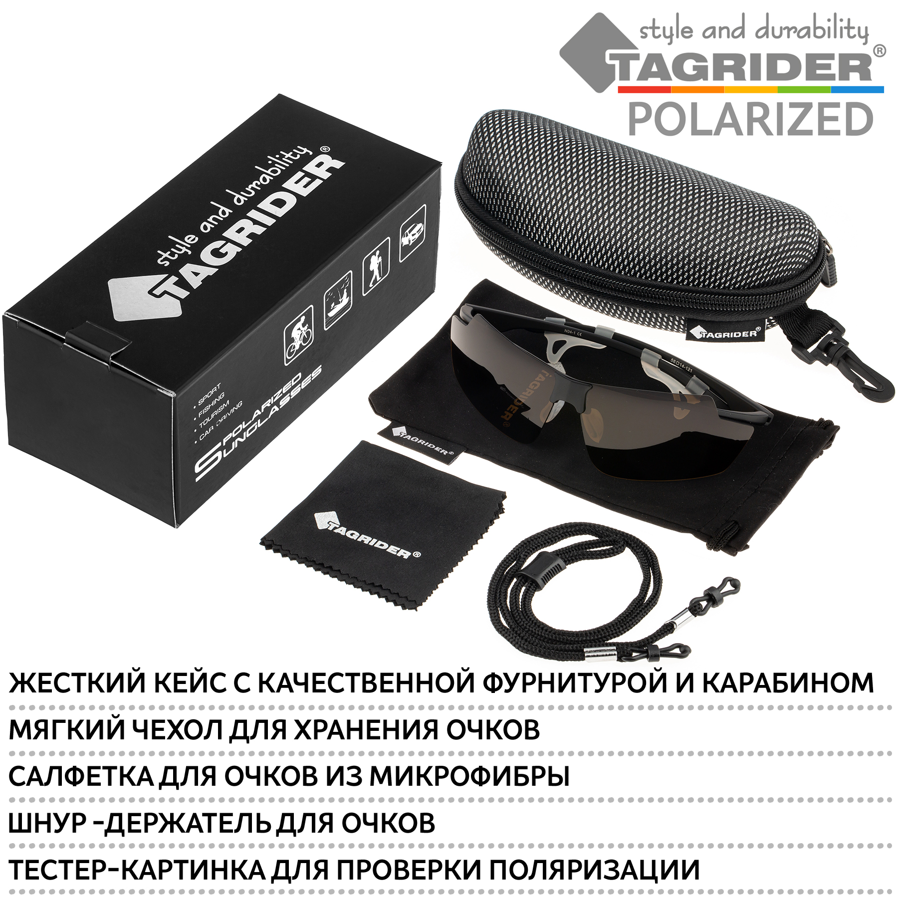 Очки поляризационные Tagrider - это идеальный выбор для тех, кто ценит комфорт и качество. Они оснащены прогрессивным UV фильтром, который защищает глаза от вредного ультрафиолетового излучения и гарантирует безопасное использование в любых условиях освещения. Прогрессивный светофильтр сохраняет естественные цвета предметов и улучшает видимость при изменении интенсивности света. Многослойная поляризация стёкол эффективно устраняет блики с отражающих поверхностей, делая изображение более чётким и контрастным. Оправа очков выполнена из гипоаллергенного и ударопрочного полимера ABS, обеспечивая максимальный комфорт и надёжность при ношении. В комплекте идёт специальная карточка для проверки поляризации очков. Для удобства пользователей очки поставляются с ударопрочным чехлом на молнии, тряпичным чехлом для хранения и практичным шнурком, который предотвращает потерю или падение очков.