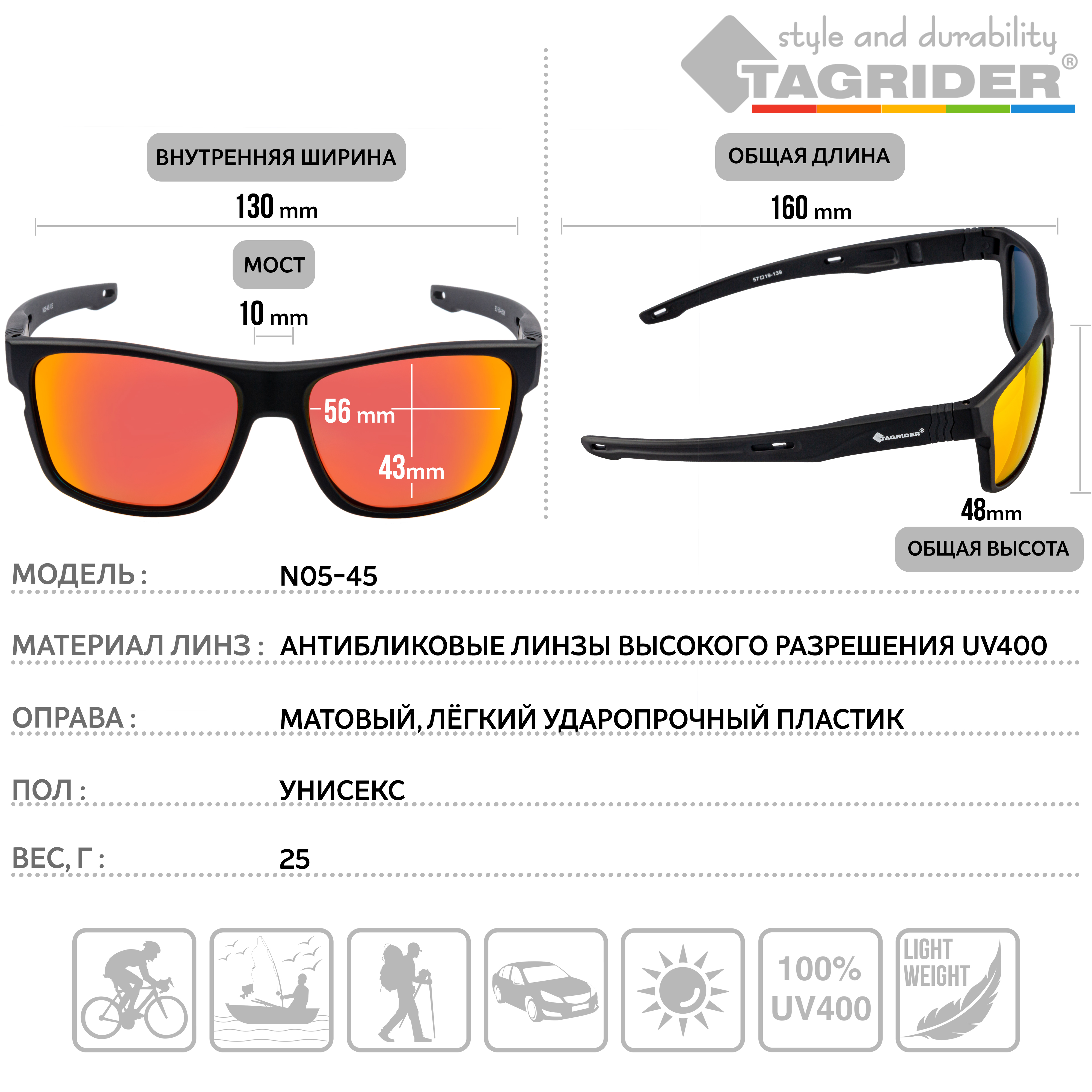 Очки поляризационные Tagrider - это идеальный выбор для тех, кто ценит комфорт и качество. Они оснащены прогрессивным UV фильтром, который защищает глаза от вредного ультрафиолетового излучения и гарантирует безопасное использование в любых условиях освещения. Прогрессивный светофильтр сохраняет естественные цвета предметов и улучшает видимость при изменении интенсивности света. Многослойная поляризация стёкол эффективно устраняет блики с отражающих поверхностей, делая изображение более чётким и контрастным. Оправа очков выполнена из гипоаллергенного и ударопрочного полимера ABS, обеспечивая максимальный комфорт и надёжность при ношении. В комплекте идёт специальная карточка для проверки поляризации очков. Для удобства пользователей очки поставляются с ударопрочным чехлом на молнии, тряпичным чехлом для хранения и практичным шнурком, который предотвращает потерю или падение очков.