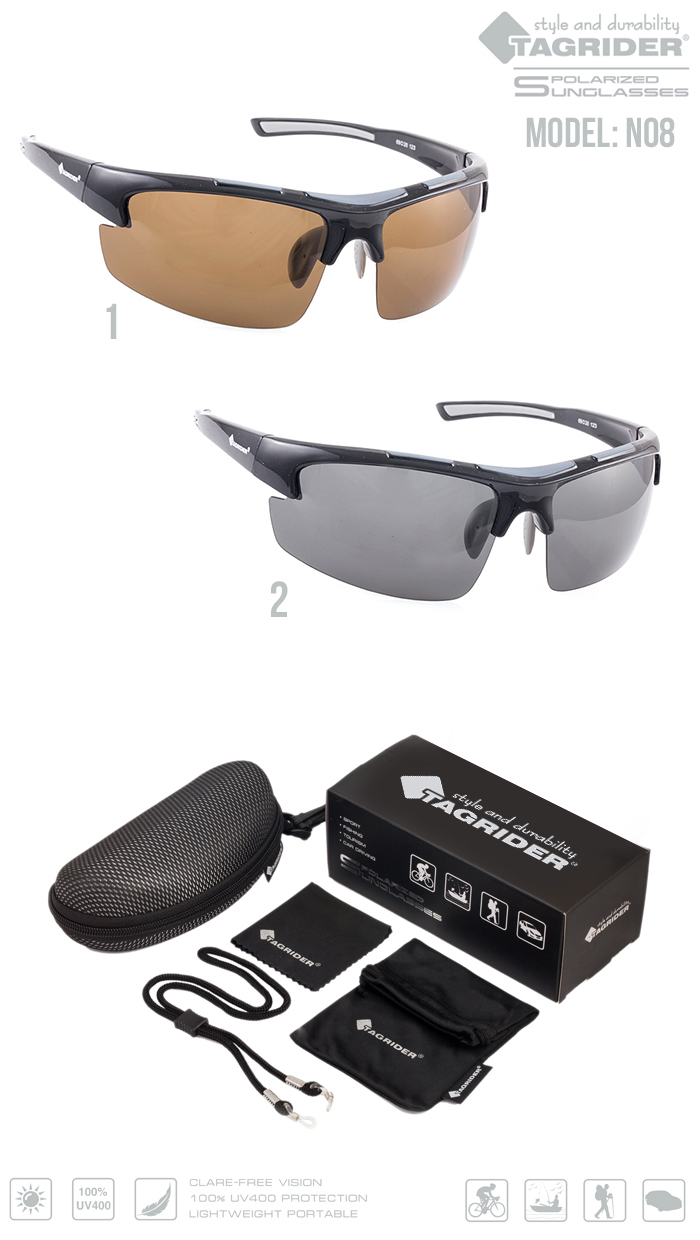 Поляризационные очки Tagrider оснащены прогрессивным 400 UV фильтром защиты от ультрафиолетового излучения, что позволяет полностью убрать негативное воздействие света на глаза и использовать их на солнце с любой интенсивностью. Прогрессивный светофильтр сохраняет всю гамму цветов предмета и усиливает свое действие с увеличением интенсивности света. Стекла с многослойной поляризацией снимают блики с любых отражающих поверхностей и делают изображение более чётким. Затылочный держатель с фиксатором, предотвратит падение и обеспечит надежную посадку очков даже при активном движении или занятии спортом. Очки выполнены из гипоаллергенного ударопрочного полимера марки ABS. В комплекте специальная карточка для проверки поляризации очков.