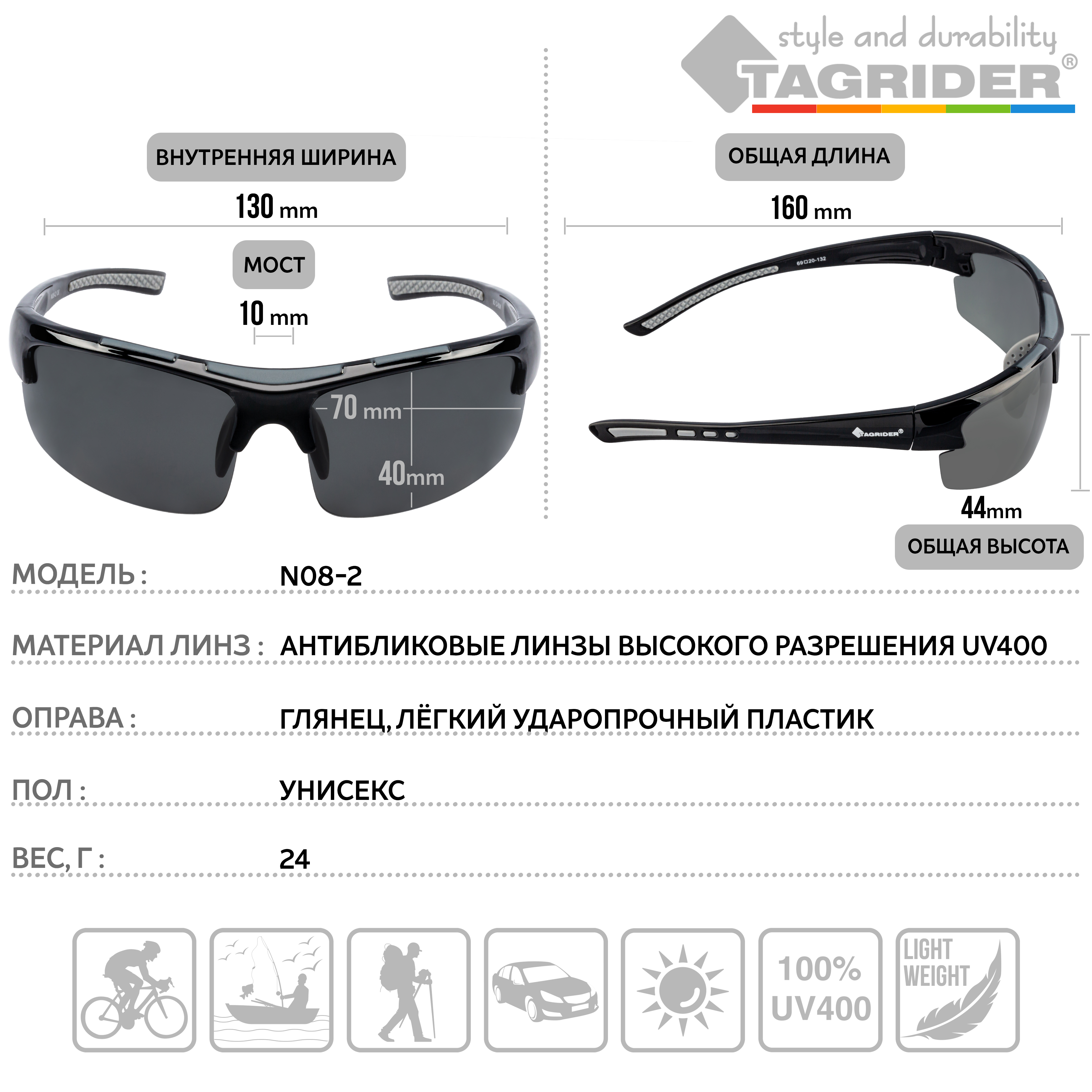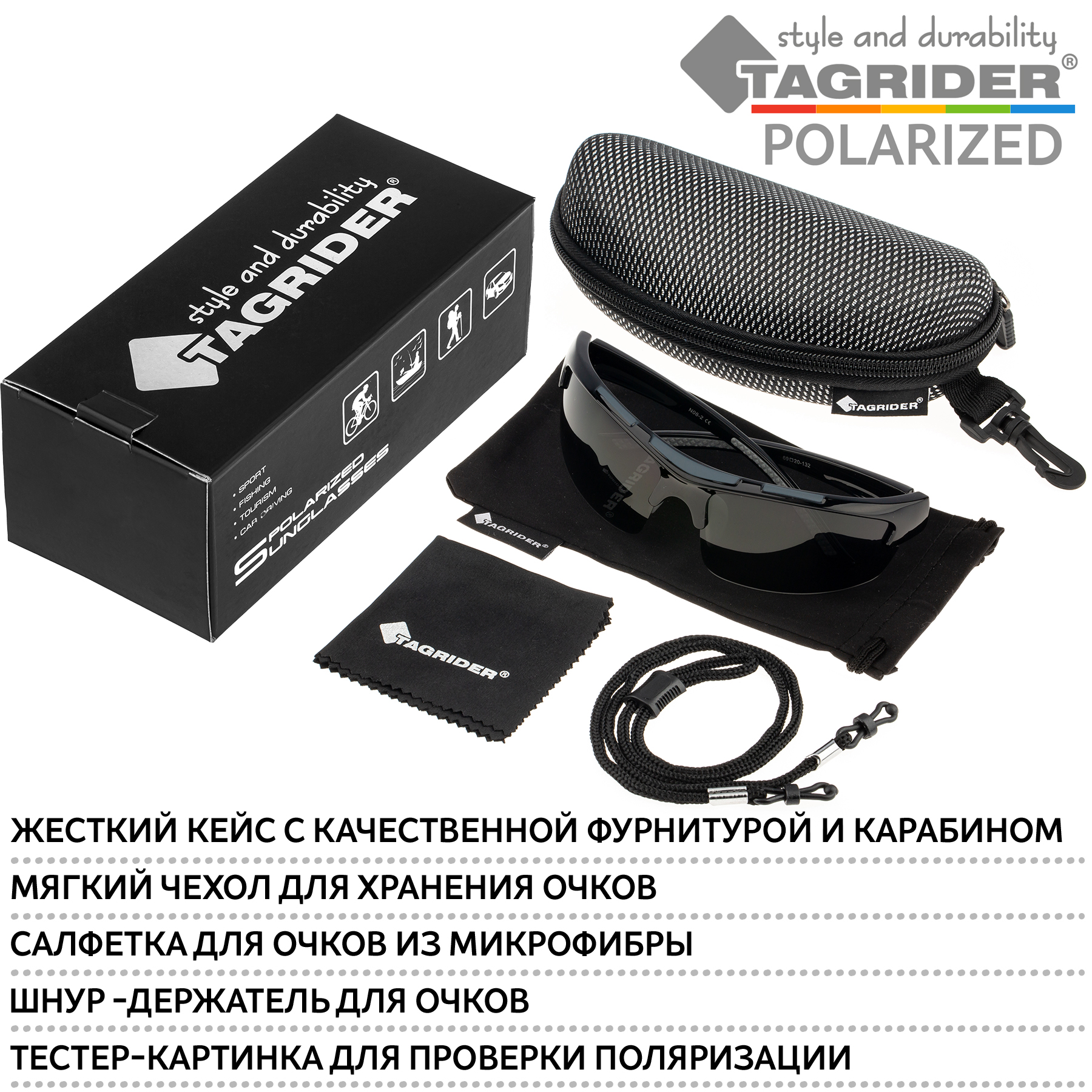 Очки поляризационные Tagrider - это идеальный выбор для тех, кто ценит комфорт и качество. Они оснащены прогрессивным UV фильтром, который защищает глаза от вредного ультрафиолетового излучения и гарантирует безопасное использование в любых условиях освещения. Прогрессивный светофильтр сохраняет естественные цвета предметов и улучшает видимость при изменении интенсивности света. Многослойная поляризация стёкол эффективно устраняет блики с отражающих поверхностей, делая изображение более чётким и контрастным. Оправа очков выполнена из гипоаллергенного и ударопрочного полимера ABS, обеспечивая максимальный комфорт и надёжность при ношении. В комплекте идёт специальная карточка для проверки поляризации очков. Для удобства пользователей очки поставляются с ударопрочным чехлом на молнии, тряпичным чехлом для хранения и практичным шнурком, который предотвращает потерю или падение очков.