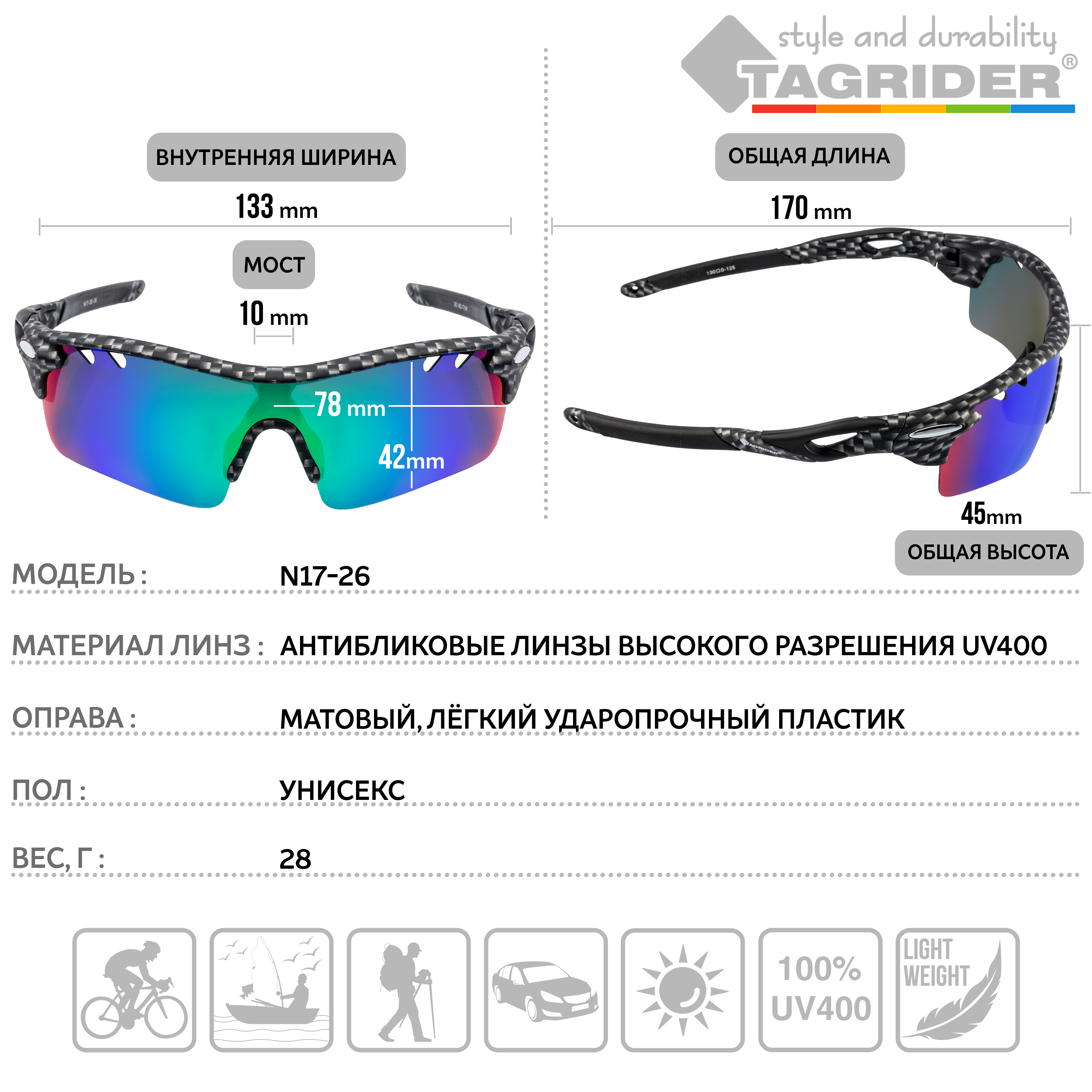 Очки поляризационные Tagrider - это идеальный выбор для тех, кто ценит комфорт и качество. Они оснащены прогрессивным UV фильтром, который защищает глаза от вредного ультрафиолетового излучения и гарантирует безопасное использование в любых условиях освещения. Прогрессивный светофильтр сохраняет естественные цвета предметов и улучшает видимость при изменении интенсивности света. Многослойная поляризация стёкол эффективно устраняет блики с отражающих поверхностей, делая изображение более чётким и контрастным. Оправа очков выполнена из гипоаллергенного и ударопрочного полимера ABS, обеспечивая максимальный комфорт и надёжность при ношении. В комплекте идёт специальная карточка для проверки поляризации очков. Для удобства пользователей очки поставляются с ударопрочным чехлом на молнии, тряпичным чехлом для хранения и практичным шнурком, который предотвращает потерю или падение очков.