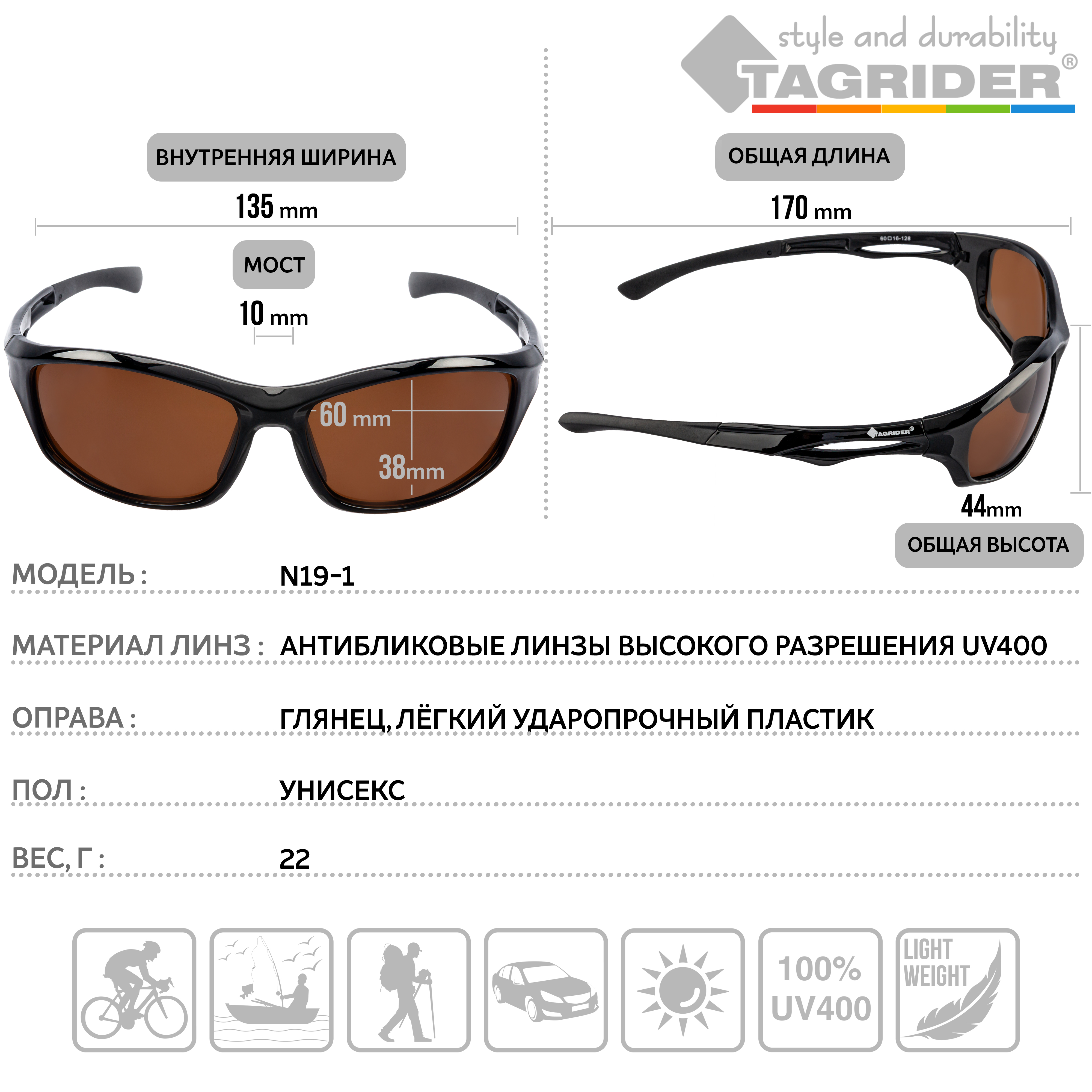 Очки поляризационные Tagrider - это идеальный выбор для тех, кто ценит комфорт и качество. Они оснащены прогрессивным UV фильтром, который защищает глаза от вредного ультрафиолетового излучения и гарантирует безопасное использование в любых условиях освещения. Прогрессивный светофильтр сохраняет естественные цвета предметов и улучшает видимость при изменении интенсивности света. Многослойная поляризация стёкол эффективно устраняет блики с отражающих поверхностей, делая изображение более чётким и контрастным. Оправа очков выполнена из гипоаллергенного и ударопрочного полимера ABS, обеспечивая максимальный комфорт и надёжность при ношении. В комплекте идёт специальная карточка для проверки поляризации очков. Для удобства пользователей очки поставляются с ударопрочным чехлом на молнии, тряпичным чехлом для хранения и практичным шнурком, который предотвращает потерю или падение очков.