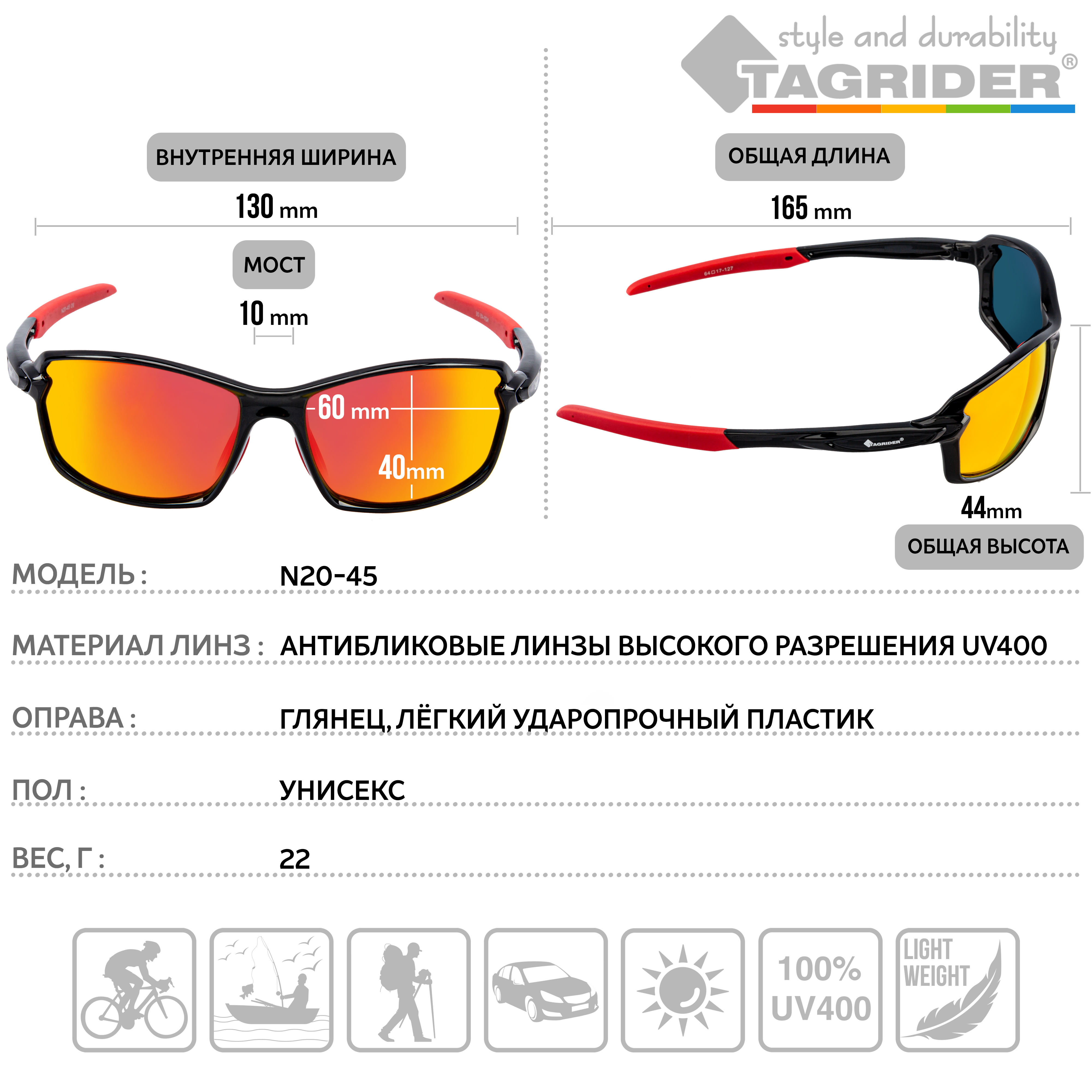 Очки поляризационные Tagrider - это идеальный выбор для тех, кто ценит комфорт и качество. Они оснащены прогрессивным UV фильтром, который защищает глаза от вредного ультрафиолетового излучения и гарантирует безопасное использование в любых условиях освещения. Прогрессивный светофильтр сохраняет естественные цвета предметов и улучшает видимость при изменении интенсивности света. Многослойная поляризация стёкол эффективно устраняет блики с отражающих поверхностей, делая изображение более чётким и контрастным. Оправа очков выполнена из гипоаллергенного и ударопрочного полимера ABS, обеспечивая максимальный комфорт и надёжность при ношении. В комплекте идёт специальная карточка для проверки поляризации очков. Для удобства пользователей очки поставляются с ударопрочным чехлом на молнии, тряпичным чехлом для хранения и практичным шнурком, который предотвращает потерю или падение очков.
