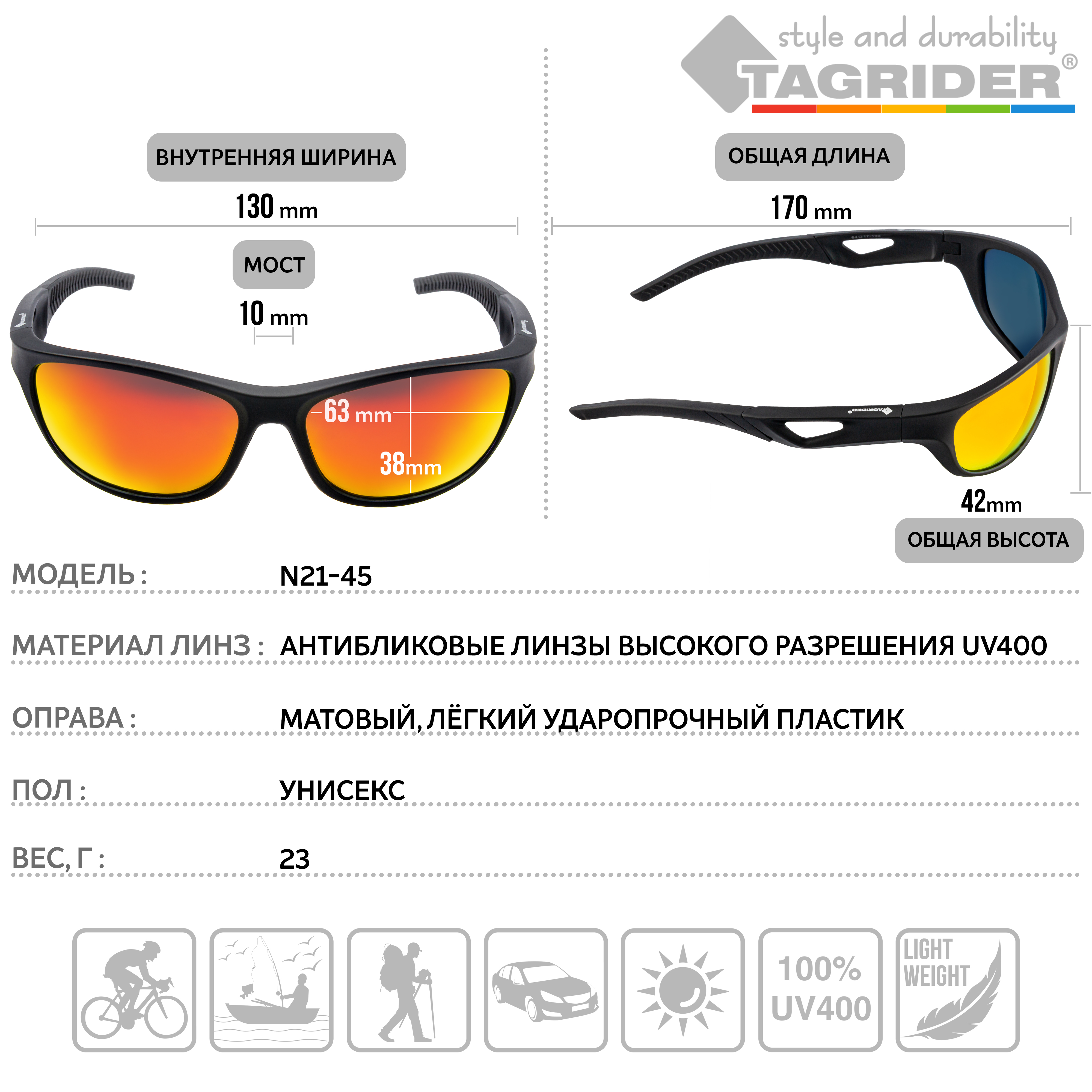 Очки поляризационные Tagrider - это идеальный выбор для тех, кто ценит комфорт и качество. Они оснащены прогрессивным UV фильтром, который защищает глаза от вредного ультрафиолетового излучения и гарантирует безопасное использование в любых условиях освещения. Прогрессивный светофильтр сохраняет естественные цвета предметов и улучшает видимость при изменении интенсивности света. Многослойная поляризация стёкол эффективно устраняет блики с отражающих поверхностей, делая изображение более чётким и контрастным. Оправа очков выполнена из гипоаллергенного и ударопрочного полимера ABS, обеспечивая максимальный комфорт и надёжность при ношении. В комплекте идёт специальная карточка для проверки поляризации очков. Для удобства пользователей очки поставляются с ударопрочным чехлом на молнии, тряпичным чехлом для хранения и практичным шнурком, который предотвращает потерю или падение очков.
