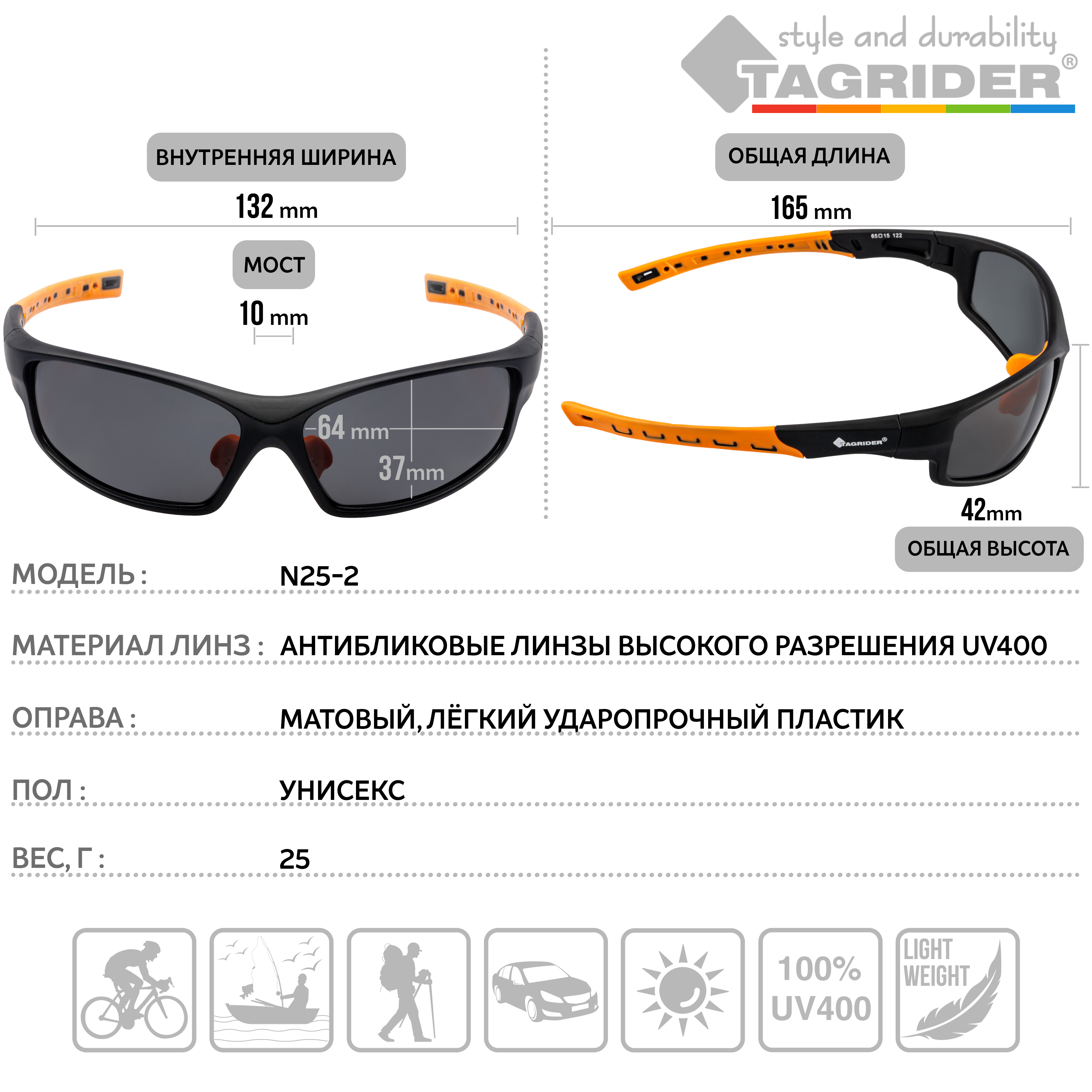 Очки поляризационные Tagrider - это идеальный выбор для тех, кто ценит комфорт и качество. Они оснащены прогрессивным UV фильтром, который защищает глаза от вредного ультрафиолетового излучения и гарантирует безопасное использование в любых условиях освещения. Прогрессивный светофильтр сохраняет естественные цвета предметов и улучшает видимость при изменении интенсивности света. Многослойная поляризация стёкол эффективно устраняет блики с отражающих поверхностей, делая изображение более чётким и контрастным. Оправа очков выполнена из гипоаллергенного и ударопрочного полимера ABS, обеспечивая максимальный комфорт и надёжность при ношении. В комплекте идёт специальная карточка для проверки поляризации очков. Для удобства пользователей очки поставляются с ударопрочным чехлом на молнии, тряпичным чехлом для хранения и практичным шнурком, который предотвращает потерю или падение очков.