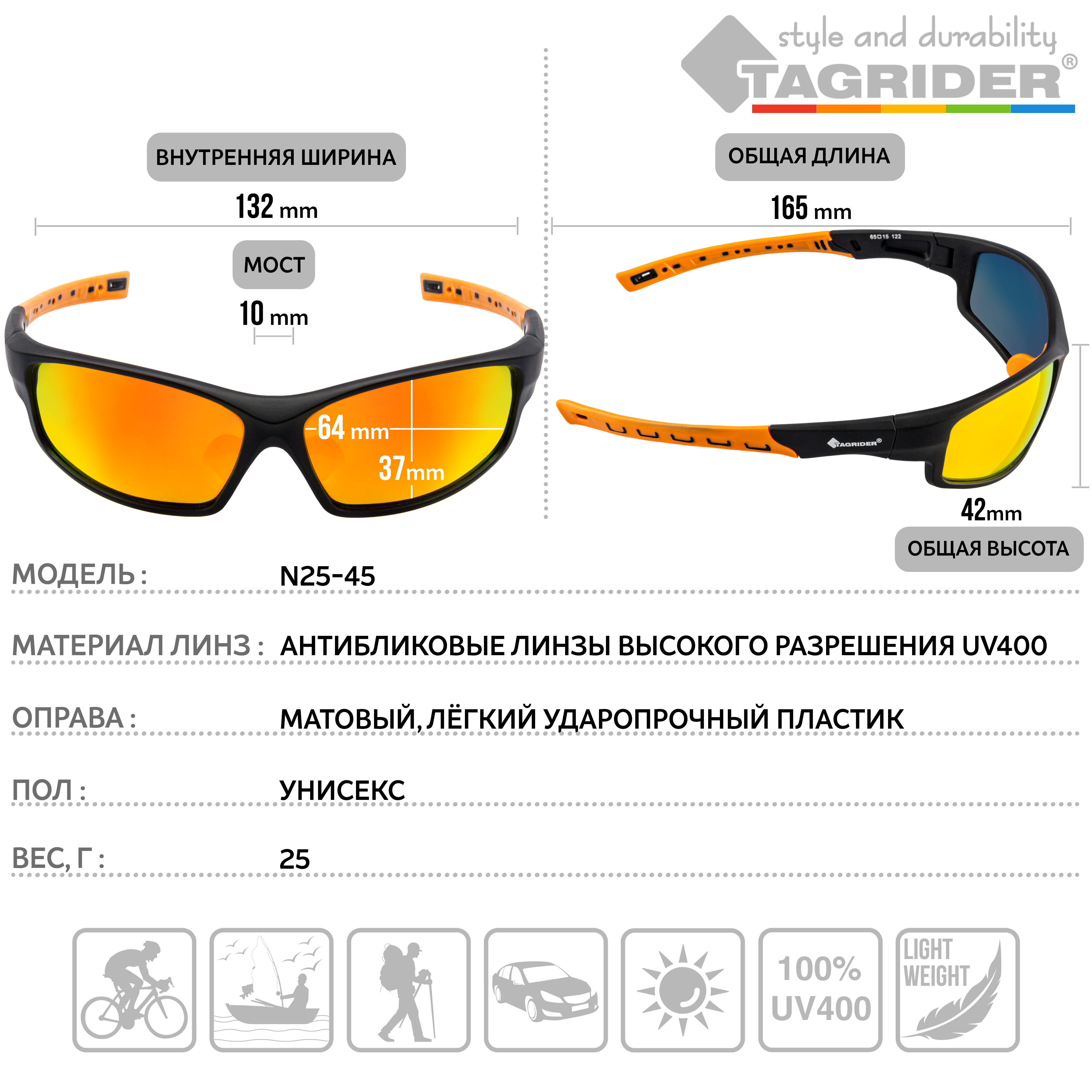 Очки поляризационные Tagrider - это идеальный выбор для тех, кто ценит комфорт и качество. Они оснащены прогрессивным UV фильтром, который защищает глаза от вредного ультрафиолетового излучения и гарантирует безопасное использование в любых условиях освещения. Прогрессивный светофильтр сохраняет естественные цвета предметов и улучшает видимость при изменении интенсивности света. Многослойная поляризация стёкол эффективно устраняет блики с отражающих поверхностей, делая изображение более чётким и контрастным. Оправа очков выполнена из гипоаллергенного и ударопрочного полимера ABS, обеспечивая максимальный комфорт и надёжность при ношении. В комплекте идёт специальная карточка для проверки поляризации очков. Для удобства пользователей очки поставляются с ударопрочным чехлом на молнии, тряпичным чехлом для хранения и практичным шнурком, который предотвращает потерю или падение очков.