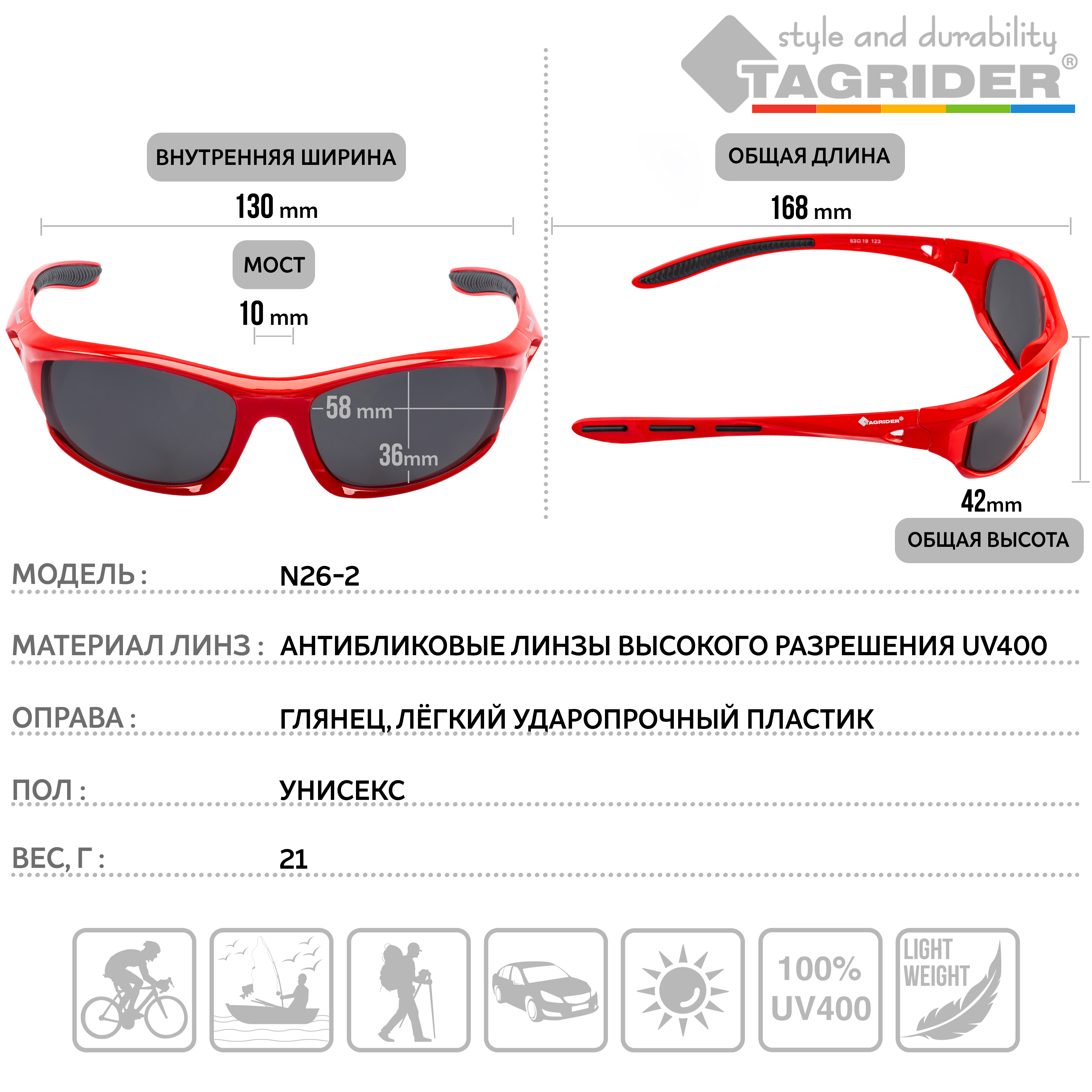Очки поляризационные Tagrider - это идеальный выбор для тех, кто ценит комфорт и качество. Они оснащены прогрессивным UV фильтром, который защищает глаза от вредного ультрафиолетового излучения и гарантирует безопасное использование в любых условиях освещения. Прогрессивный светофильтр сохраняет естественные цвета предметов и улучшает видимость при изменении интенсивности света. Многослойная поляризация стёкол эффективно устраняет блики с отражающих поверхностей, делая изображение более чётким и контрастным. Оправа очков выполнена из гипоаллергенного и ударопрочного полимера ABS, обеспечивая максимальный комфорт и надёжность при ношении. В комплекте идёт специальная карточка для проверки поляризации очков. Для удобства пользователей очки поставляются с ударопрочным чехлом на молнии, тряпичным чехлом для хранения и практичным шнурком, который предотвращает потерю или падение очков.