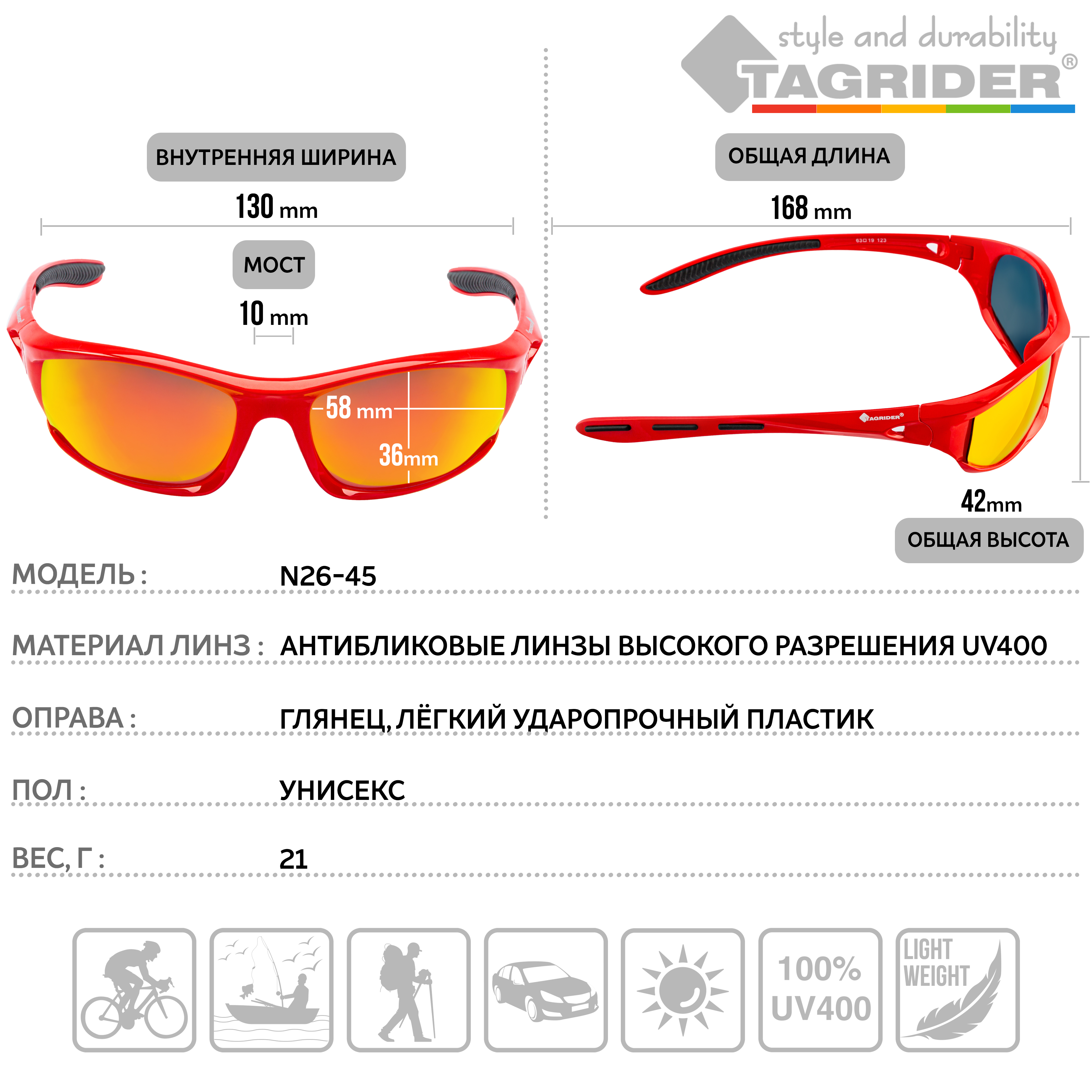 Очки поляризационные Tagrider - это идеальный выбор для тех, кто ценит комфорт и качество. Они оснащены прогрессивным UV фильтром, который защищает глаза от вредного ультрафиолетового излучения и гарантирует безопасное использование в любых условиях освещения. Прогрессивный светофильтр сохраняет естественные цвета предметов и улучшает видимость при изменении интенсивности света. Многослойная поляризация стёкол эффективно устраняет блики с отражающих поверхностей, делая изображение более чётким и контрастным. Оправа очков выполнена из гипоаллергенного и ударопрочного полимера ABS, обеспечивая максимальный комфорт и надёжность при ношении. В комплекте идёт специальная карточка для проверки поляризации очков. Для удобства пользователей очки поставляются с ударопрочным чехлом на молнии, тряпичным чехлом для хранения и практичным шнурком, который предотвращает потерю или падение очков.