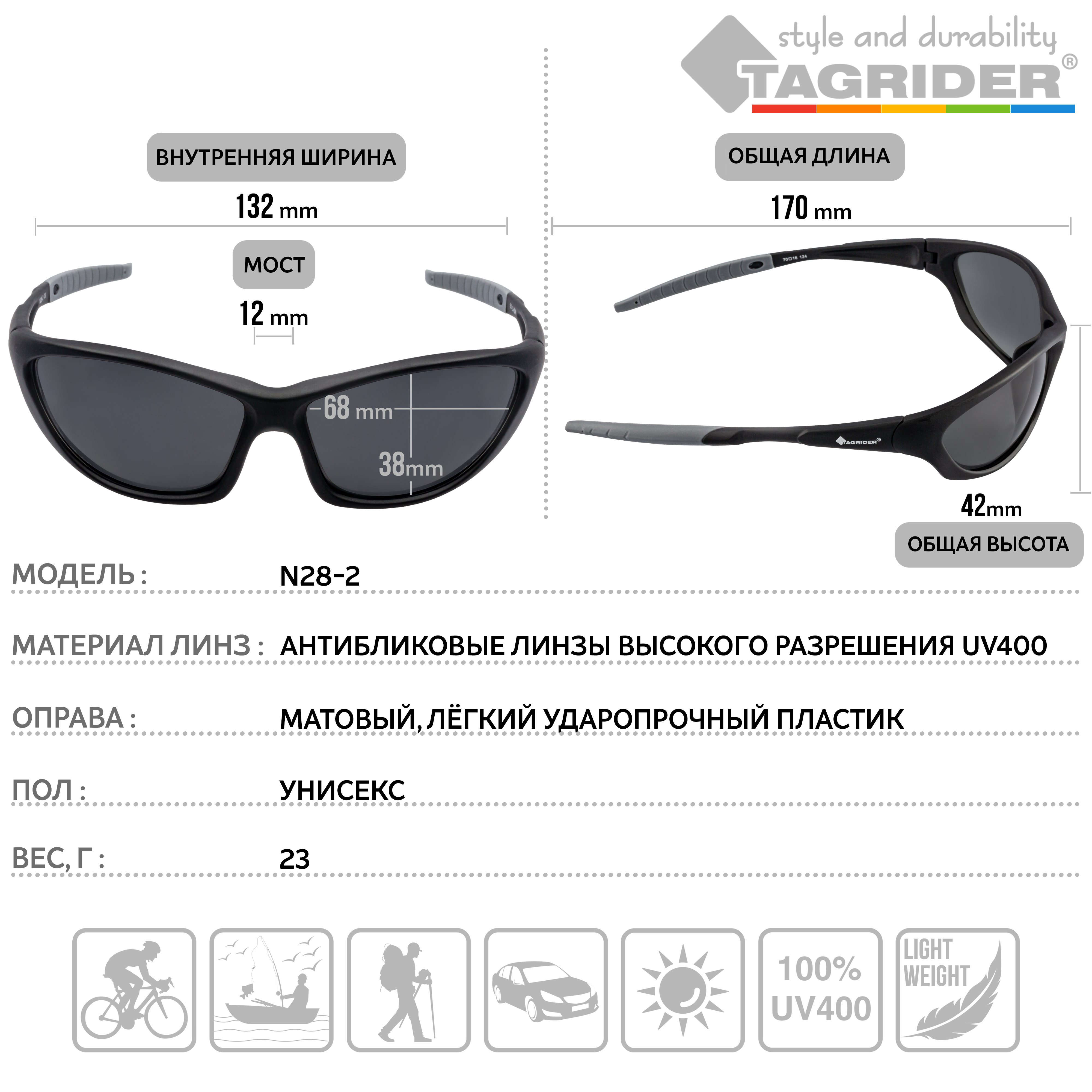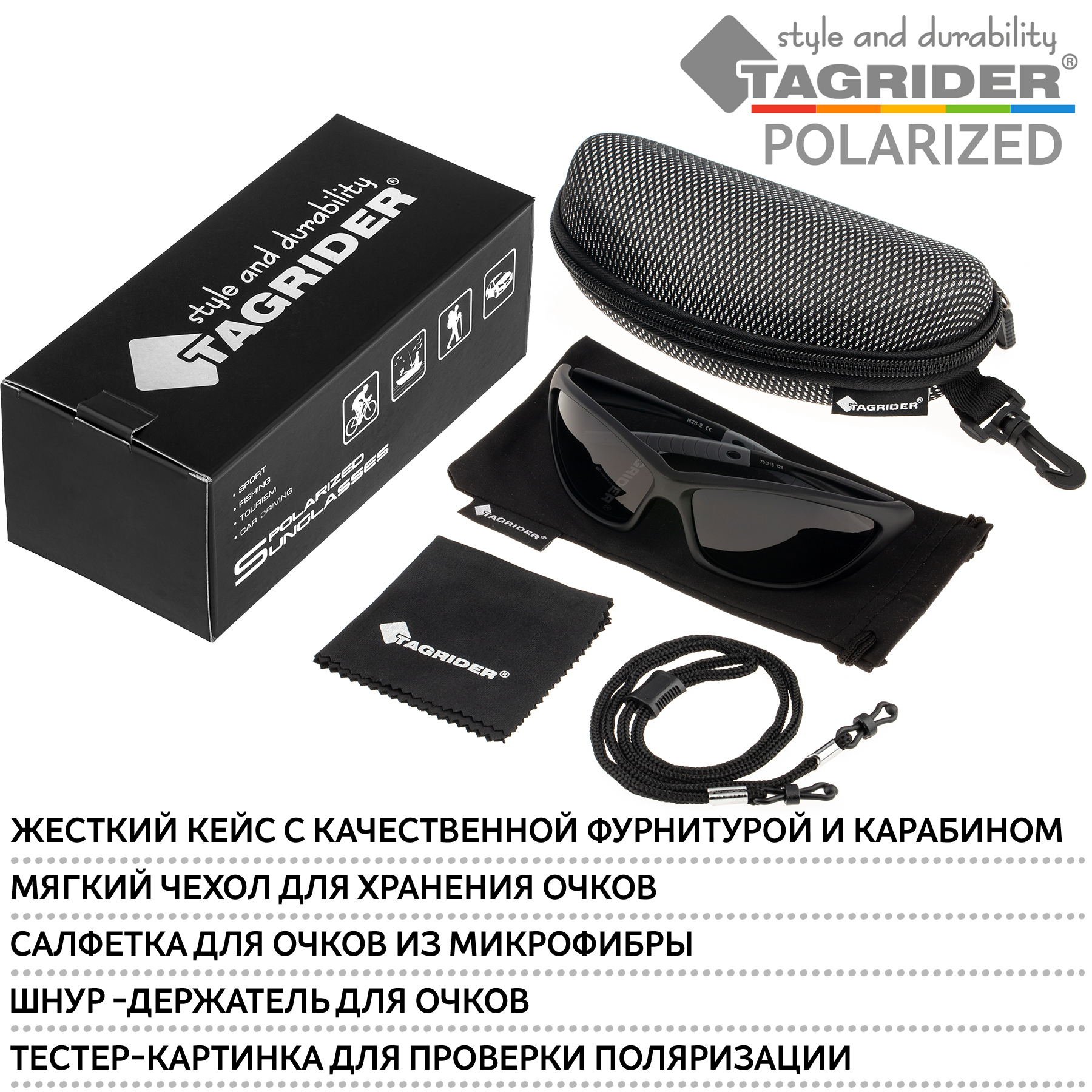 Очки поляризационные Tagrider - это идеальный выбор для тех, кто ценит комфорт и качество. Они оснащены прогрессивным UV фильтром, который защищает глаза от вредного ультрафиолетового излучения и гарантирует безопасное использование в любых условиях освещения. Прогрессивный светофильтр сохраняет естественные цвета предметов и улучшает видимость при изменении интенсивности света. Многослойная поляризация стёкол эффективно устраняет блики с отражающих поверхностей, делая изображение более чётким и контрастным. Оправа очков выполнена из гипоаллергенного и ударопрочного полимера ABS, обеспечивая максимальный комфорт и надёжность при ношении. В комплекте идёт специальная карточка для проверки поляризации очков. Для удобства пользователей очки поставляются с ударопрочным чехлом на молнии, тряпичным чехлом для хранения и практичным шнурком, который предотвращает потерю или падение очков.