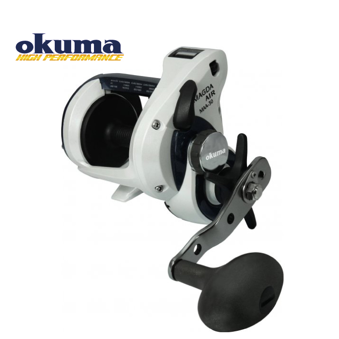"Okuma Magda Air MAA-30D - мультипликаторная катушка типа ""бочонок"", предназначенная для ловли дорожкой или троллингом cредней и крупной хищной рыбы в пресноводных водоемах. Отличается комбинированной конструкцией корпуса с интегрированными боковыми крышками - значительно увеличивающей жесткость и прочность всей конструкции. Катушка имеет очень низкую посадку - как у бросковых мультипликаторов, что позволило уменьшить размер ее корпуса и использовать шпулю с большей лесоемкостью. Главная пара ее механизма изготовлена из латуни, благодаря чему способна выдерживать большие нагрузки и обладает повышенной износостойкостью. 2 стальных шариковых и 1 роликовый подшипник обеспечивают мультипликатору ровную плавную работу. Катушка снабжена современной мультидисковой системой торможения Carbonite и функцией мгновенного стопора обратного хода Quick-set. Также она оборудована счетчиком лески, с помощью которого можно контролировать ее отпуск и отслеживать глубину ловли. Имеется встроенный сигнализатор поклевки - механическая трещотка. Мультипликатор снабжен мощной ухватистой стальной рукояткой имеющей 2 степени регулировки. Катушка праворукая."
