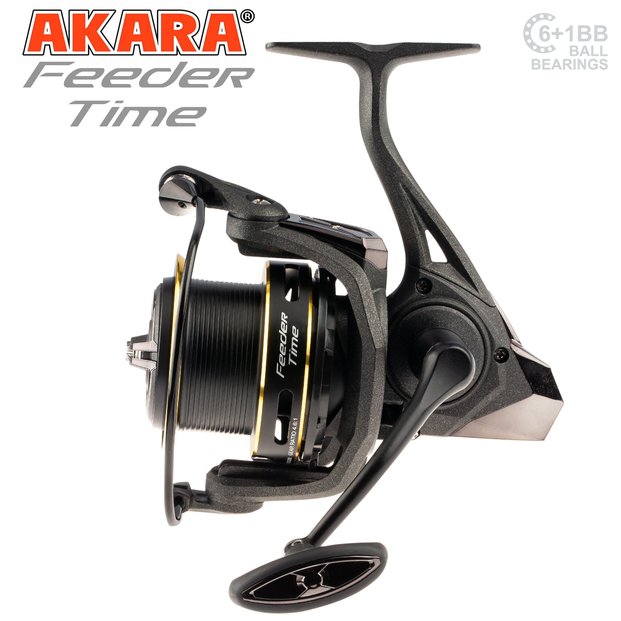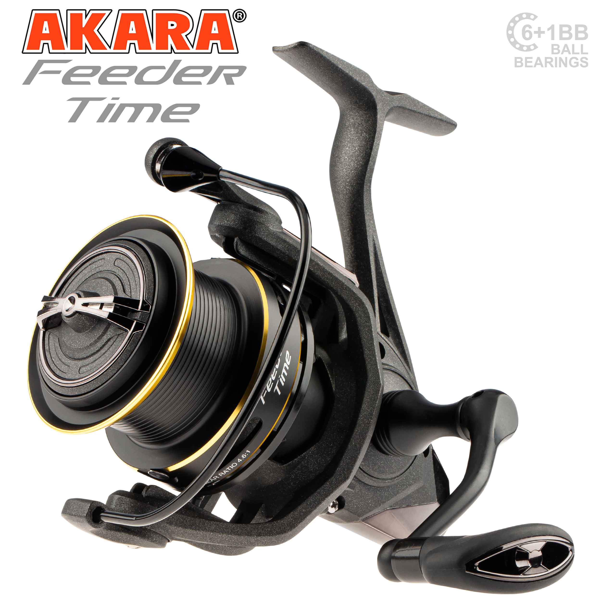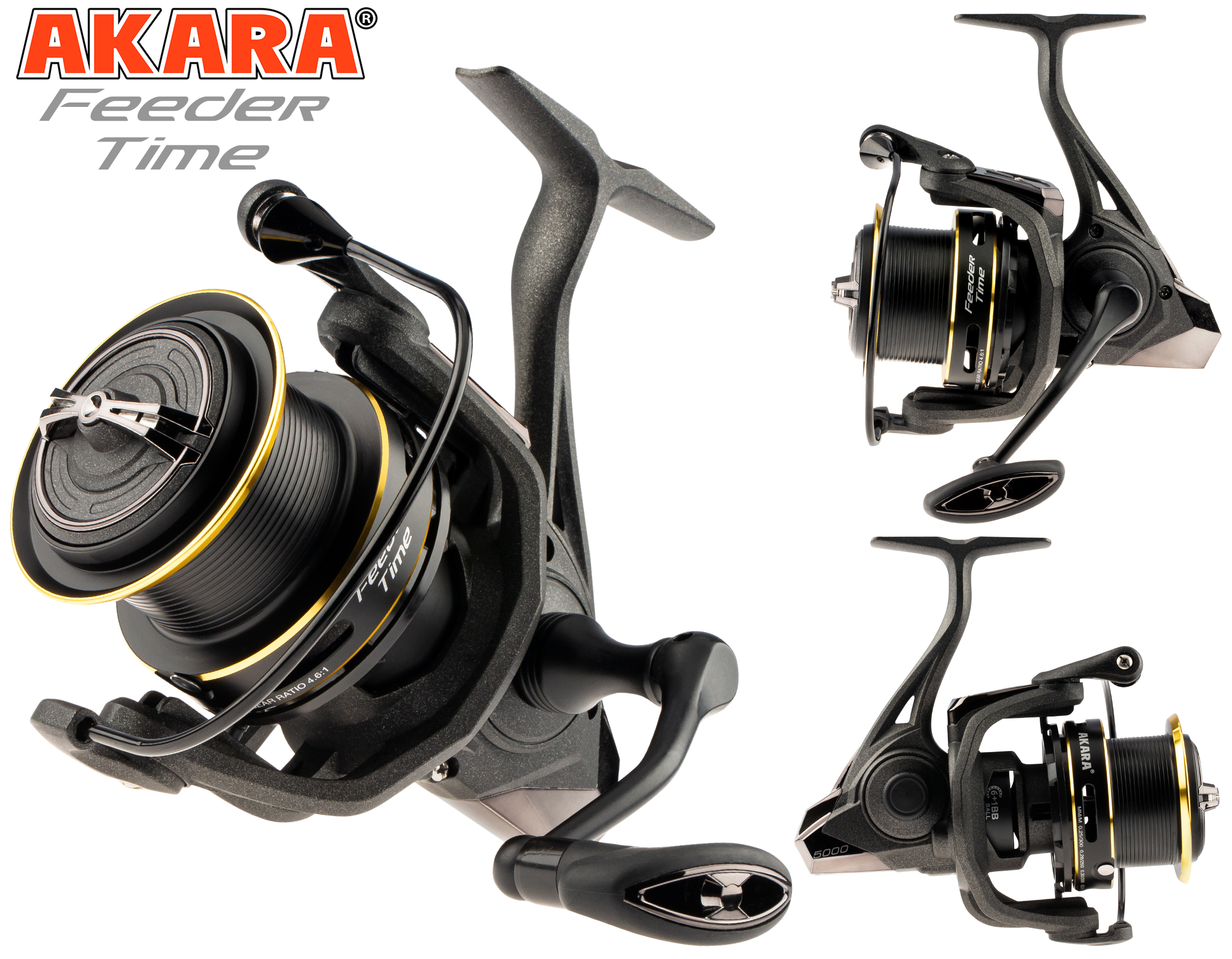 Серия мощных фидерных катушек Akara Feeder Time. Главной особенностью катушек является бесконечный винт, который обладает рядом преимуществ перед кулисным механизмом: более плавная работа механизма, более высокое качество намотки плетеной лески, долговечность. Ударопрочный композитный полимер корпуса гарантирует устойчивость к механическим повреждениям и долговечность. В катушке используется 6+1 высокопрочных шарикоподшипников. Передаточное соотношение составляет 4.6:1, что обеспечивает замечательные тяговые характеристики. Быстрый фрикцион позволяет адаптировать катушку для использования как в классической фидерной ловле, так и в стиле Flat Method, что расширяет их функциональность. В серию вошли 2 катушки 4000 и 5000 размеров с увеличенной, алюминиевой шпулей, вес катушек составляет 361 и 369 грамм соответственно.