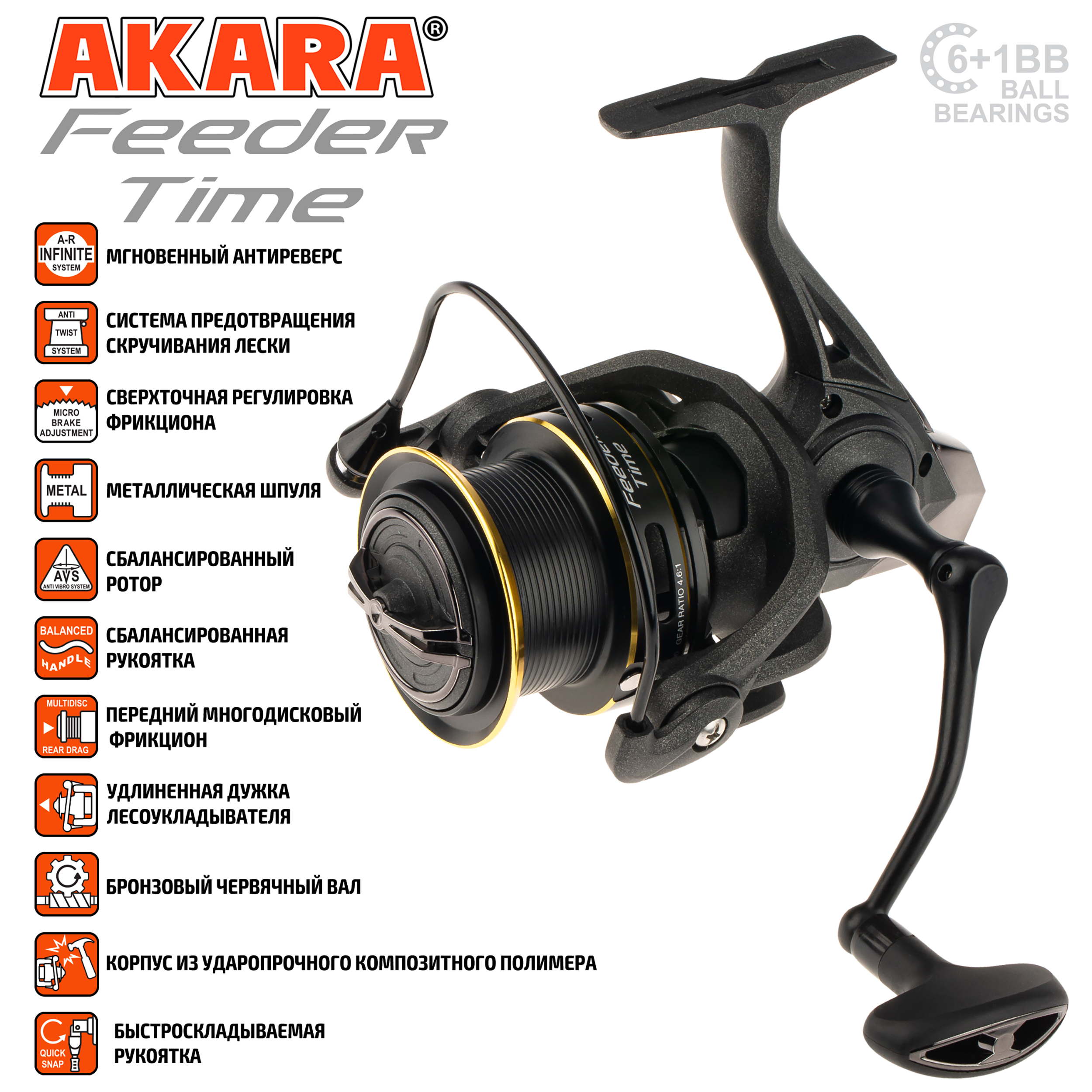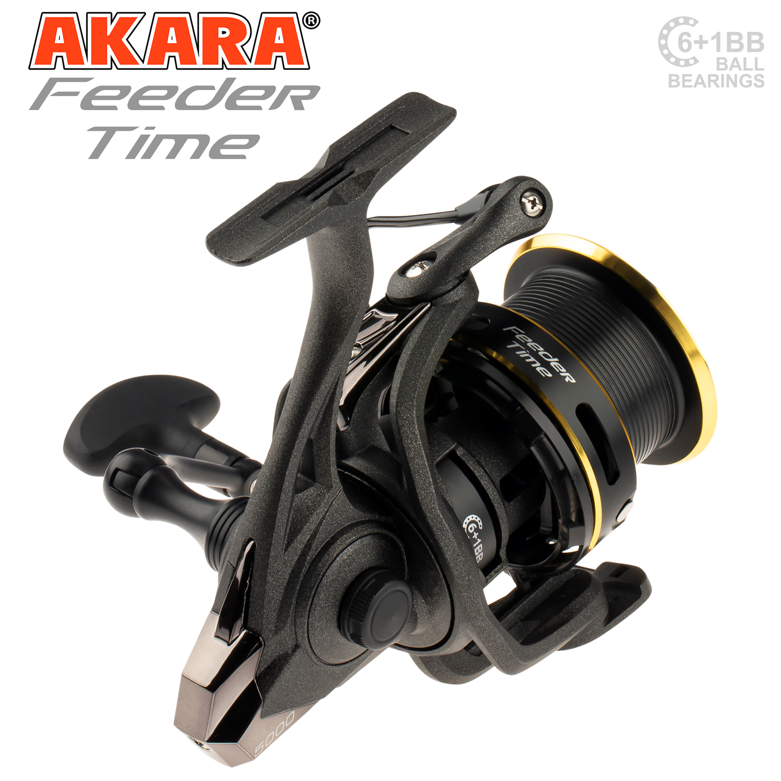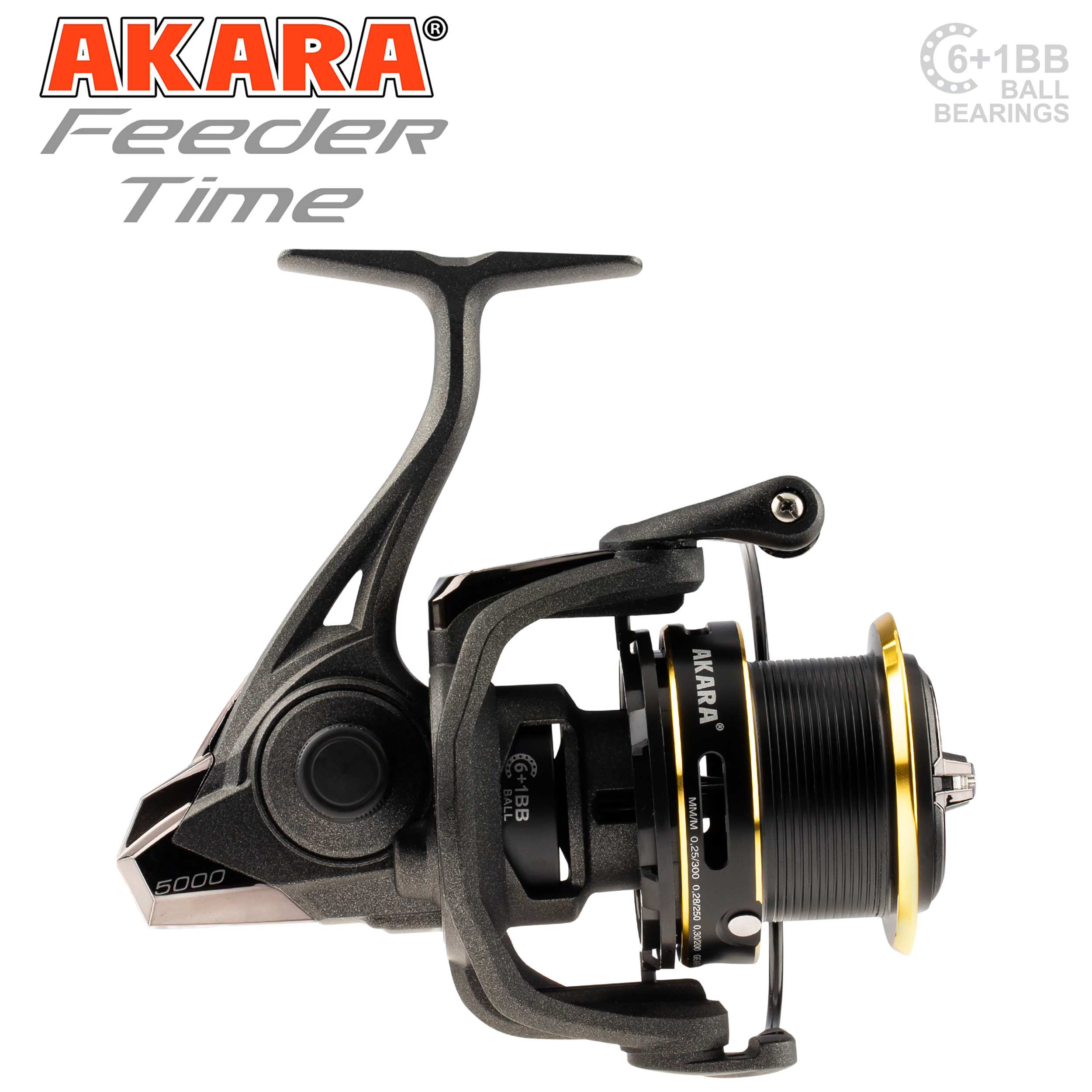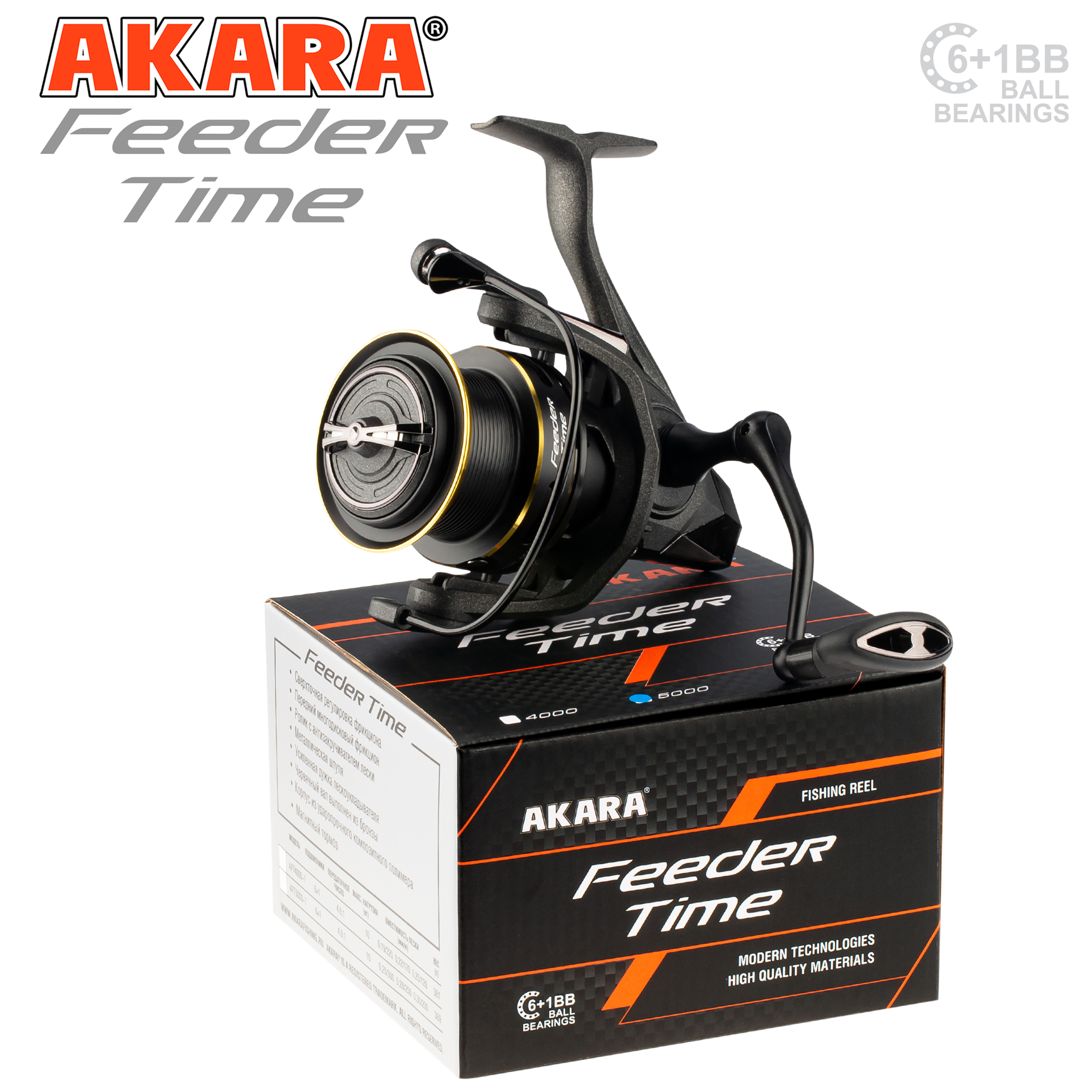 Серия мощных фидерных катушек Akara Feeder Time. Главной особенностью катушек является бесконечный винт, который обладает рядом преимуществ перед кулисным механизмом: более плавная работа механизма, более высокое качество намотки плетеной лески, долговечность. Ударопрочный композитный полимер корпуса гарантирует устойчивость к механическим повреждениям и долговечность. В катушке используется 6+1 высокопрочных шарикоподшипников. Передаточное соотношение составляет 4.6:1, что обеспечивает замечательные тяговые характеристики. Быстрый фрикцион позволяет адаптировать катушку для использования как в классической фидерной ловле, так и в стиле Flat Method, что расширяет их функциональность. В серию вошли 2 катушки 4000 и 5000 размеров с увеличенной, алюминиевой шпулей, вес катушек составляет 361 и 369 грамм соответственно.