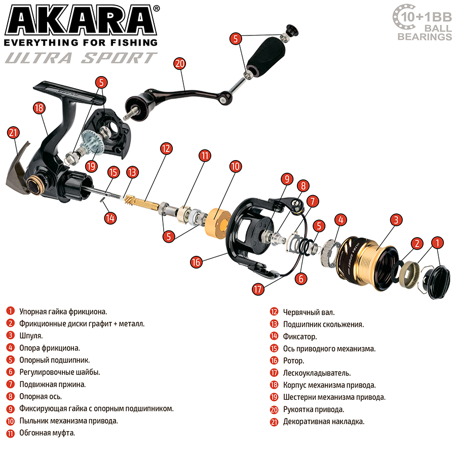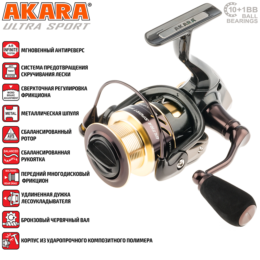 Akara Ultra Sport - серия безынерционных катушек с передаточным числом 5,2:1. В катушках размещены одиннадцать подшипников, которые позволяют эксплуатировать катушку в экстремальных условиях и выдерживать значительные нагрузки при вываживании рыбы. Корпус катушки, ее ротор, изготовлены из ударопрочного композитного полимера. Усиленная дужка лесоукладывателя с конусной направляющей и подшипниковым роликом, предотвратит перекручивание лески при забросе приманки и позволит идеально уложить леску при намотке на шпулю. Мультидисковый передний фрикцион с промасленными войлочными шайбами позволяет тонко отрегулировать фрикцион и настроить снасть так, чтобы предупредить возможные рывки рыбы и ее сход.