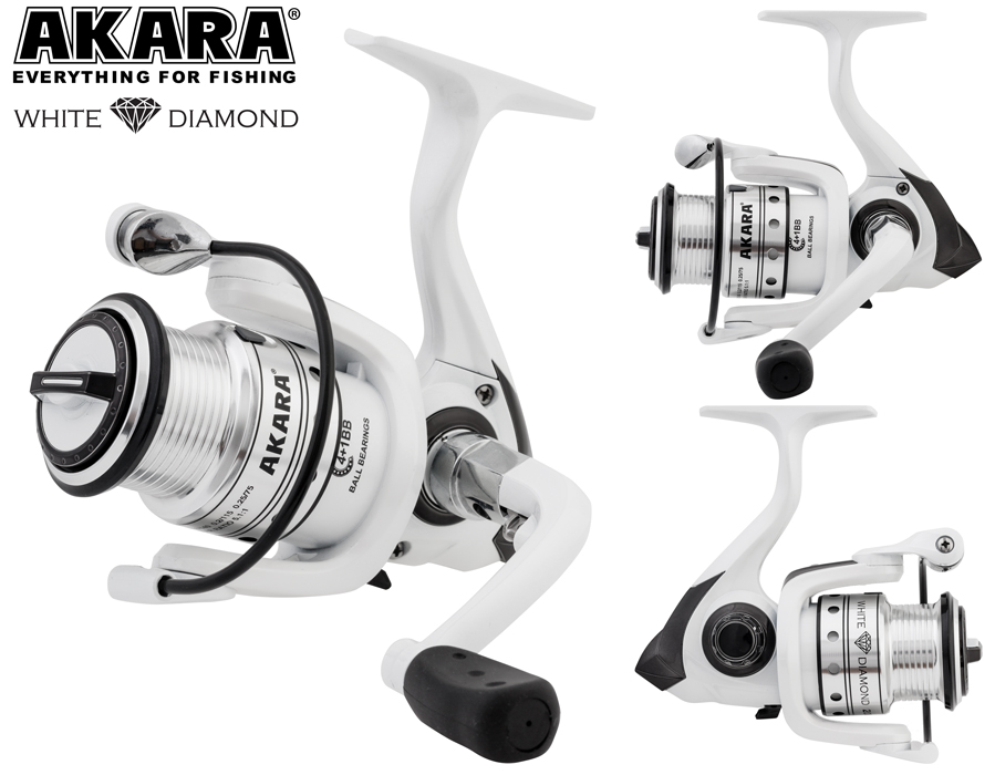 Akara White Diamond - среднескоростная безынерционная катушка среднего ценового сегмента. Akara White Diamond выпускается в трех размерах: 1000, 2000, 3000. Размер 1000 прекрасно подойдет для любителей поплавочной и матчевой ловли, а также для спиннинговой ловли на сверхлегкие приманки Ultralight. 2000 и 3000 подойдут для начинающих спиннингистов. Основная шпуля из алюминиевого сплава с перфорацие. Специальный профиль бортика шпули позволяет совершать дальние и точные забросы , предотвращает образование петель. Катушка прекрасно проявляет себя в работе со шнурами. В комплекте поставляется дополнительная шпуля из графита аналогичной емкости для использования с монофильными лесками. Полая дужка лесоукладывателя предотвращает закручивание лески и исключает самосброс. Корпус катушки выполнен из современного композита, что делает ее достаточно легкой в своем классе при сохранении прочностн