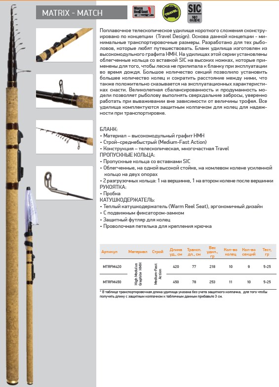 Поплавочное телескопическое удилище короткого сложения сконструировано по концепции (Travel Design). Основа данной концепции - минимальные транспортировочные размеры. Разработано для тех рыболовов, которые любят путешествовать. Бланк удилища Maximus Matrix изготовлен из высокомодульного графита HMH. На удилищах этой серии установлены облегченные кольца со вставкой SIC на высоких ножках, которые применены для того, чтобы леска не прилипала к бланку при эксплуатации во время дождя. Большое количество секций позволило установить большее количество колец и сократить расстояние между ними, что также положительно сказывается на эксплуатационных характеристиках снасти. Великолепная сбалансированность и продуманность модели позволяет рыболову выполнять сверхдальние забросы, уверенно работать при вываживании вне зависимости от величины трофея. Все удилища комплектуются защитным колпачком для колец для надежности при транспортировке. Бланк: Материал – высокомодульный графит HMH. Строй–среднебыстрый (Medium-Fast Action). Конструкция – телескопическая, многочастная Travel. Пропускные кольца: Пропускные кольца со вставками SIC. Облегченные, на одной высокой опоре, на комлевом колене усиленной кольцо на двух опорах. 2 разгрузочных кольца: 1 на вершинке, 1 на втором колене после вершинки. Рукоятка: Пробка. Катушкодержатель: Теплый катушкодержатель (Warm Reel Seat), эргономичный дизайн. С подвижным фиксатором-замком. Защитный футляр для колец. Проволочная петелька для крепления крючка.