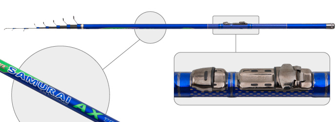 Samurai - болонская удочка от Akara. Характеризуется небольшим весом и высокими прочностными характеристиками. Широкий весовой диапазон используемых снастей делает удочку универсальной по использованию и позволяет её использовать как для ловли на течении так и в стоячей воде. Быстросъёмный катушкодержатель. Графит марки IM-9.