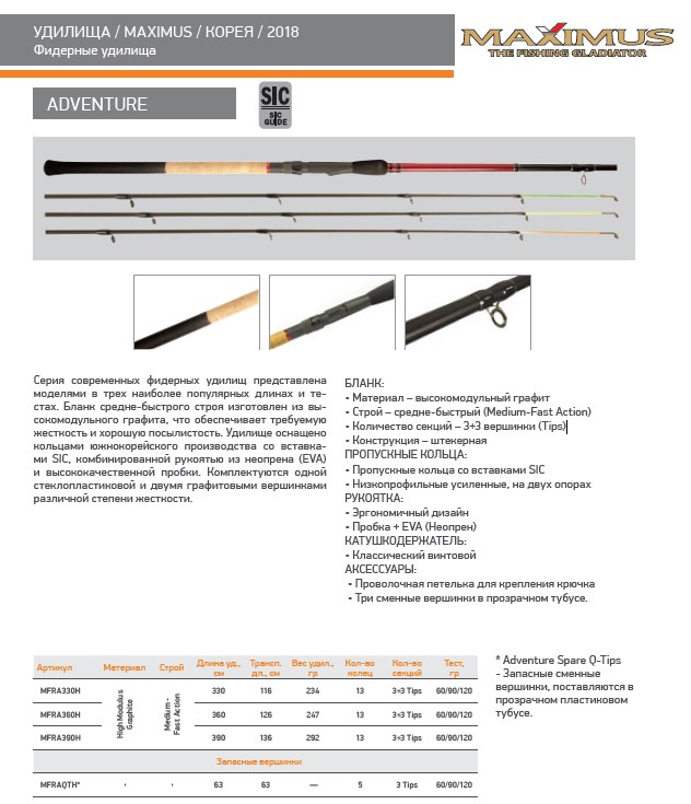 Серия современных фидерных удилищ Adventure представлена моделями в трех наиболее популярных длинах и тестах. Бланк средне-быстрого строя изготовлен из высокомодульного графита, что обеспечивает требуемую жесткость и хорошую посылистость. Удилище оснащено кольцами южнокорейского производства со вставками SIC, комбинированной рукоятью из неопрена (EVA) и высококачественной пробки. Комплектуются одной стеклопластиковой и двумя графитовыми вершинками различной степени жесткости. Бланк: Материал – высокомодульный графит. Строй – средне-быстрый (Medium-Fast Action). Количество секций – 3+3 вершинки. Конструкция – штекерная. Пропускные кольца: Пропускные кольца со вставками SIC. Низкопрофильные усиленные, на двух опорах. Рукоятка: Эргономичный дизайн. Пробка + EVA (Неопрен). Катушкодержатель: Классический винтовой. Аксессуары: Проволочная петелька для крепления крючка. Три сменные вершинки в прозрачном тубусе.