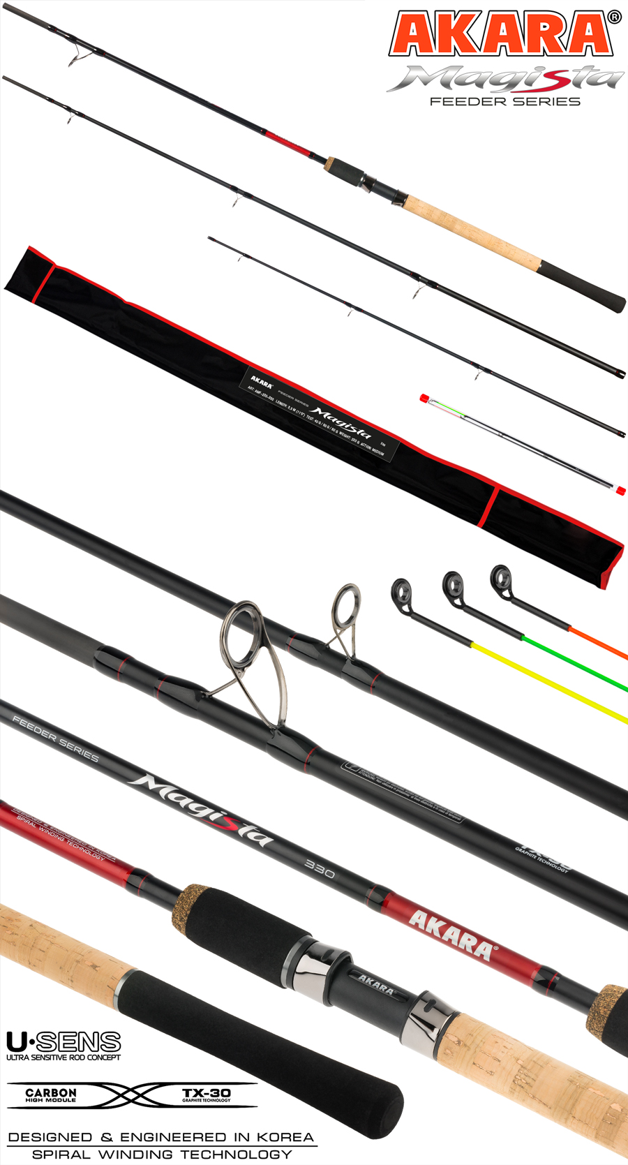 Фидер Akara Magista Feeder - это расширение уже известной серии спиннинговых удилищ и рыболовных катушек Magista. Фидерное удилище обладает строем Medium (средний). Представлено в трех тестах 60-90-120, 90-120-150 и 120-150-180 грамм. Бланки удилищ Akara Magista Feeder выполнены из высокомодульного карбона TX-30 производства Японского концерна Toray. Бланк удилища оснащен кольцами Kujira с покрытием оксида циркония, что позволяет не повреждать леску при ее использовании во время заброса кормушки или вываживании рыбы. Цельная рукоять удилища выполнена из пробки и неопрена и оснащена надежным катушкодержателем.