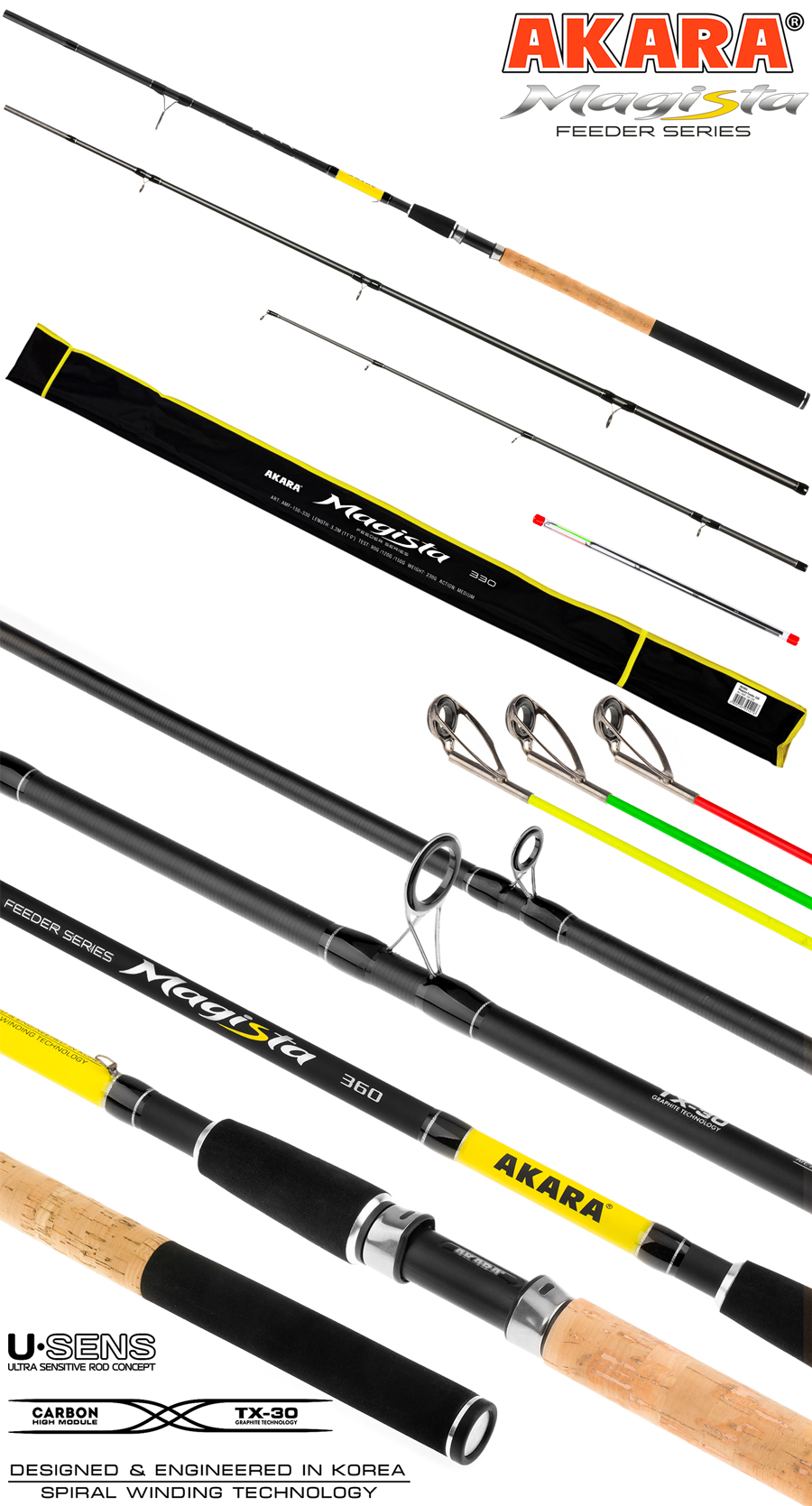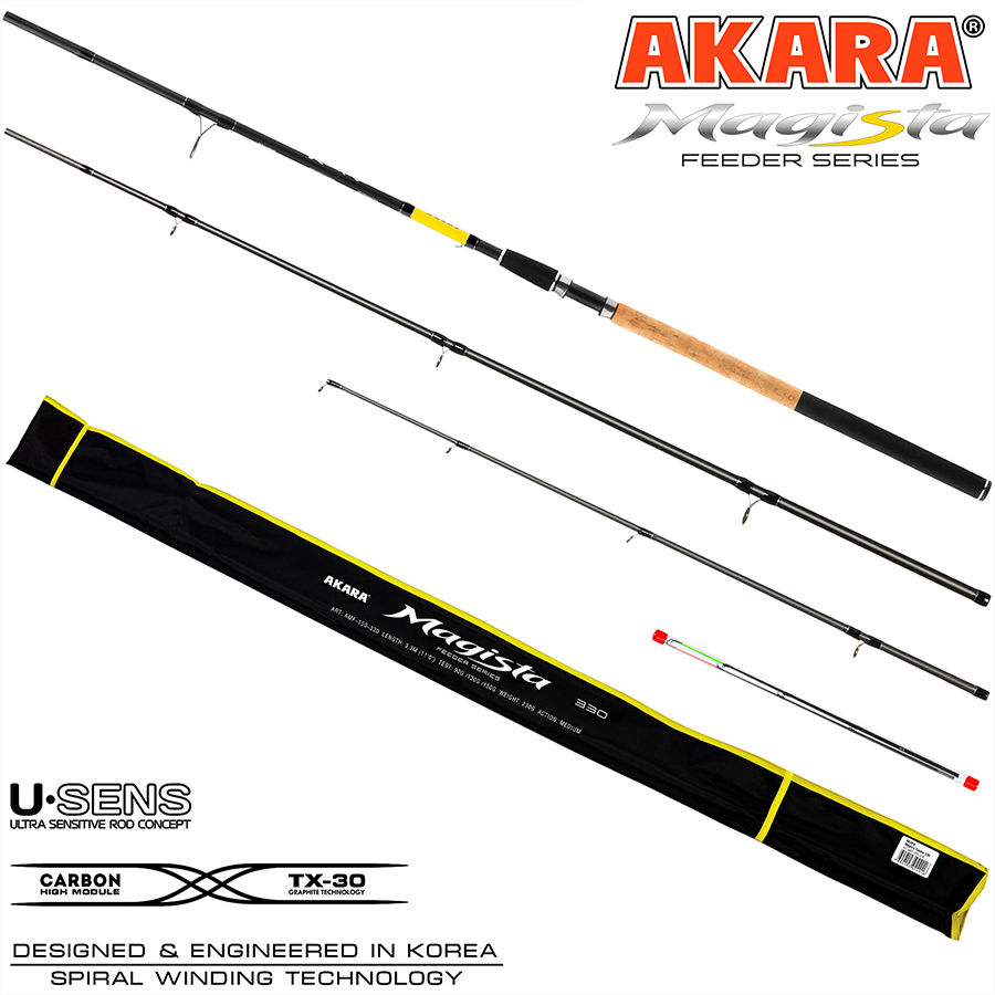 Фидер Akara Magista Feeder - это расширение уже известной серии спиннинговых удилищ и рыболовных катушек Magista. Фидерное удилище обладает строем Medium (средний). Представлено в трех тестах 60-90-120, 90-120-150 и 120-150-180 грамм. Бланки удилищ Akara Magista Feeder выполнены из высокомодульного карбона TX-30 производства Японского концерна Toray. Бланк удилища оснащен кольцами Kujira с покрытием оксида циркония, что позволяет не повреждать леску при ее использовании во время заброса кормушки или вываживании рыбы. Цельная рукоять удилища выполнена из пробки и неопрена и оснащена надежным катушкодержателем.