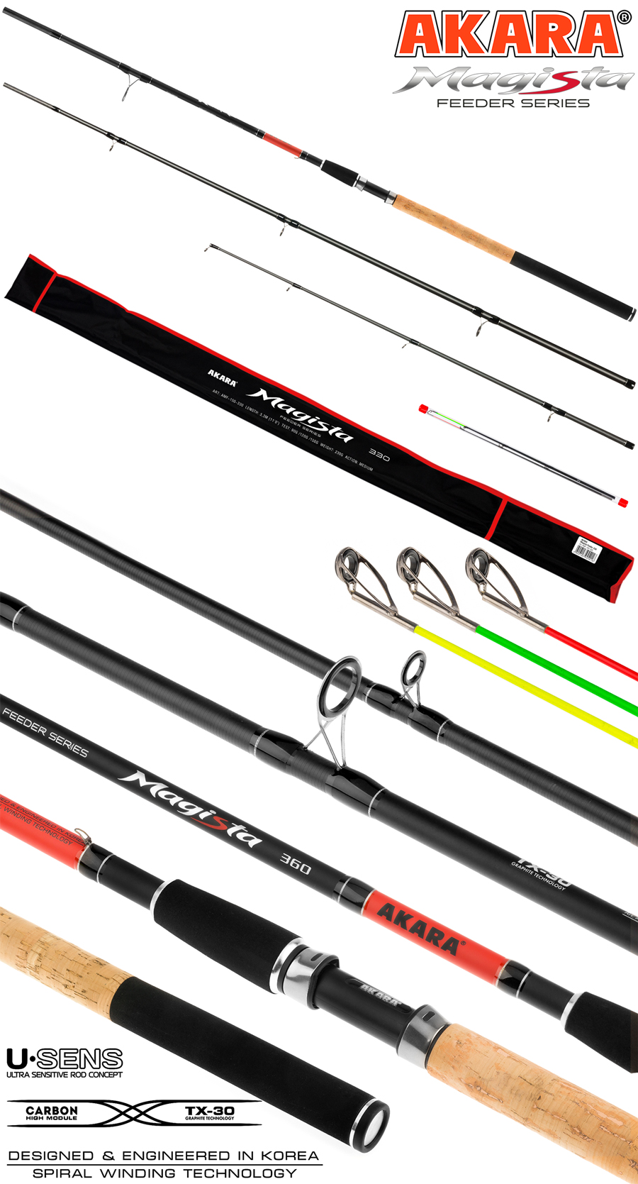 Фидер Akara Magista Feeder - это расширение уже известной серии спиннинговых удилищ и рыболовных катушек Magista. Фидерное удилище обладает строем Medium (средний). Представлено в трех тестах 60-90-120, 90-120-150 и 120-150-180 грамм. Бланки удилищ Akara Magista Feeder выполнены из высокомодульного карбона TX-30 производства Японского концерна Toray. Бланк удилища оснащен кольцами Kujira с покрытием оксида циркония, что позволяет не повреждать леску при ее использовании во время заброса кормушки или вываживании рыбы. Цельная рукоять удилища выполнена из пробки и неопрена и оснащена надежным катушкодержателем.