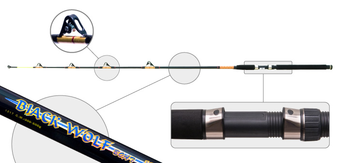 Black Wolf - силовой цельный стеклопластиковый спиннинг с кольцами-роликами. Используется при морской бортовой ловле, трофейной рыбалке и ловле с повышенными нагрузками для снасти.
