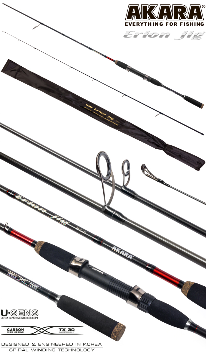 Обновленная линейка спиннингов Akara Erion Jig TX-30 включает в себя четыре модели бланков с разными тестами по приманкам (2 – 8, 3 – 12, 5 – 25, 10 – 30 грамм), и в разных длинах (1,98, 2,10, 2,28, 2,48, 2,70 метров) каждый. Спиннинги изготовлены из графита марки TX-30 японского концерна Toray и оснащены пропускными кольцами Kujira Super Contact ZrO2. Данные спиннинги позиционируются как джиговые (благодаря очень информативному бланку), но при этом отлично работают и с другими типами приманок. Имеют удобный катушкодержатель и разнесенную EVA – рукоять. В зависимости от длины позволяют ловлю как с берега, так и с лодки.