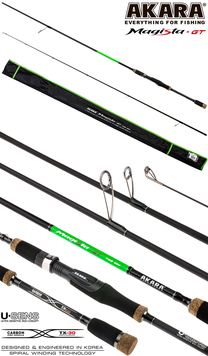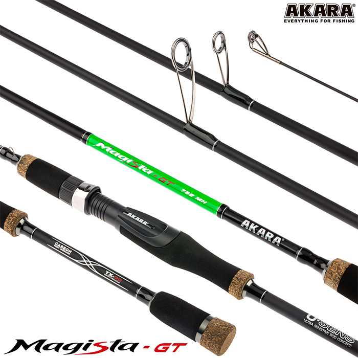 Спиннинг Akara Magista GT (10,5-35) - джиговый тубулар спиннинг средне-быстрого строя. Это обновленная линейка уже зарекомендовавших себя спиннингов Akara Magista, исполнена с использованием современных технологий. Cпиннинги собраны на основе бланка из высокомодульного карбона TX-30 (40-ton) производства Японского концерна Toray. Используется современная технология UPIT (Under Pressure Innovative Technology) при которой бланк спиннинга накатывается под давлением в термической камере. Данная технология позволяет создавать бланки с минимальным количеством связующего вещества и высокой плотности скручивания. Это делает спиннинги звонкими, чувствительными, при полном сохранении прочностных характеристик. Катушкодержатель имеет эргономичную форму, обеспечивает удобный и надежный хват во время ловли. Данные спиннинги оснащены облегченными кольцами из оксида циркония Kujira XR Long Super Hard ZrO2 (1600-1800H, kg/mm2) расставленными по технологии New Guide System, которая позволяет оптимально расположить кольца на бланке, определить их количество и размер (вес). Подходит как для ловли с лодки, так и с берега.