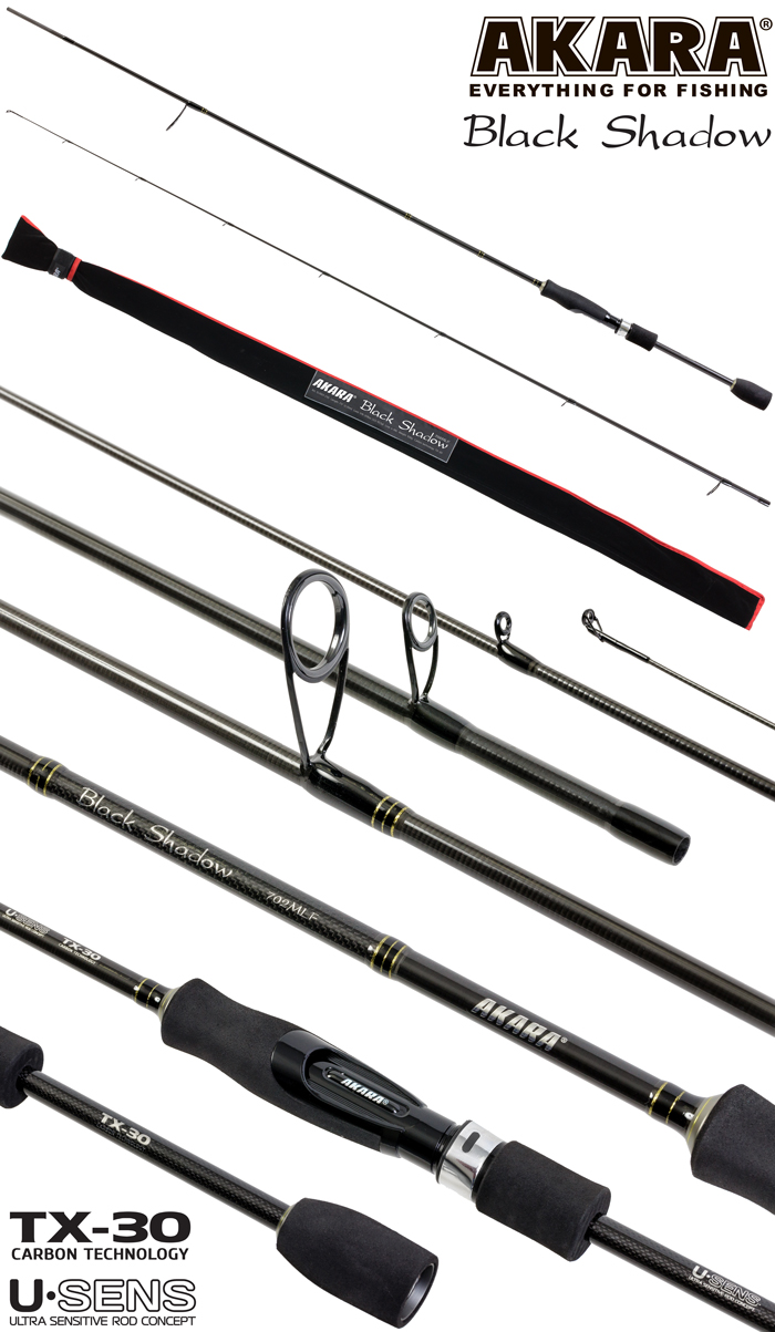 Akara Black Shadow - спиннинг быстрого строя для ловли на джиг и твич. Удилище хорошо отзывается на приманки в диапазоне 3,5-10,5 г. Чистый контактник. Как по строю, так и по быстроте работы бланка. Разнесенная EVA ручка и специальные кольца Kujira Super Contact ZrO2 хорошо передают чувствительность бланка. Таких характеристик удалось добиться благодаря использованию при его производстве технологии U-SENS. Бланк спекается при помощи высокомолекулярной порошковой смолы, количество связующего вещества при этом удается снизить на четверть. Black Shadow подходит как для ловли с лодки так и с берега.