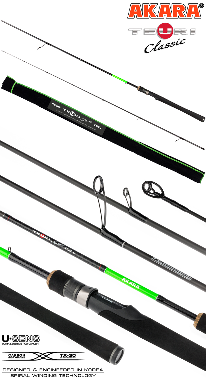 Спиннинги Akara Teuri Classic - это широкая линейка удилищ для самых разных условий ловли. Данные спиннинги собраны на основе бланка из высокомодульного карбона TX-30 (40-ton) производства Японского концерна Toray. При производстве используется современная технология UPIT (Under Pressure Innovative Technology) при которой бланк спиннинга накатывается под давлением в термической камере. Использование данной технологии позволяет создать бланки с минимальным количеством связующего вещества и высокой плотности скручивания. Спиннинги Akara Teuri Classic укомплектованы облегченными кольцами из оксида циркония Kujira XR Long Super Hard ZrO2 (1600- 1800H, kg/mm2) расставленными по технологии New Guide System, которая позволяет оптимально расположить кольца на бланке, определить их количество и размер (вес). Вы можете быть уверенны в равномерном распределении нагрузки на бланк удилища в момент вываживания добычи. При этом спиннинг сохраняет отличные бросковые характеристики и сохраняет целостность вашего шнура в течении долгого времени. При производстве наших спиннингов мы стараемся совместить новейшие разработки и технологии с потребностями современных рыболовов во всех регионах нашей страны и за ее пределами. Также мы стремимся сделать наши удилища доступными для рядовых пользователей и людей, которые только начинают свой путь в мире рыбалки.