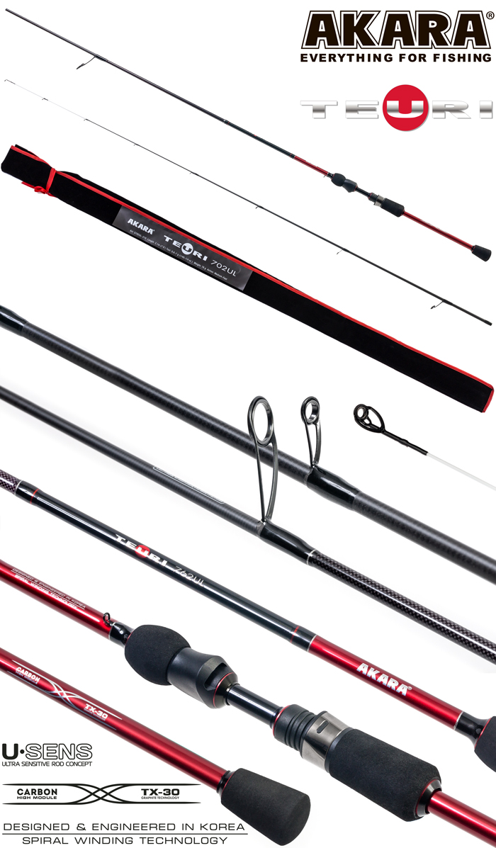 Спиннинги Akara Teuri с индексом ULS имеют тест 0,6-7г и предназначены для ловли на самые легкие приманки. Интегрированный чувствительный кончик Solid Tip и средне-быстрый строй намекает на «микроджиговую» направленность удилища. Тем не менее, оно будет уместно при ловле на колеблющиеся и вращающиеся блесна малых размеров и небольшие воблеры. Также приятно удивит и вес спиннинга, при росте 1,83м он весит всего – 68г! Удилище выпускается в 4-х длинах для разных условий ловли.