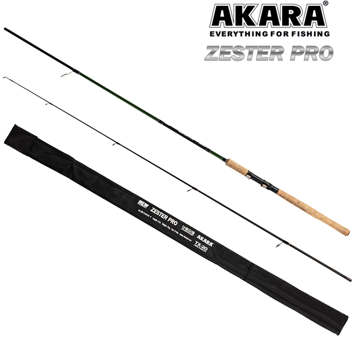 Akara Zester Pro TX-20 – спинниниг угольный, штекерный (2 - ух составной). Универсальный спиннинг среднего строя, отлично подходит для ловли как джигом, так и другими приманками такими как вращающиеся и колеблющиеся блесны, а также воблеры. Благодаря использованию графита концерна Toray TX-20 (30-ton) и инновационным технологиям плетения бланка спиннинг обладает повышенной чувствительностью при проводке. Удилище комплектуется пропускными кольцами Kujira (Япония) с расстановкой по технологии New Guide System.