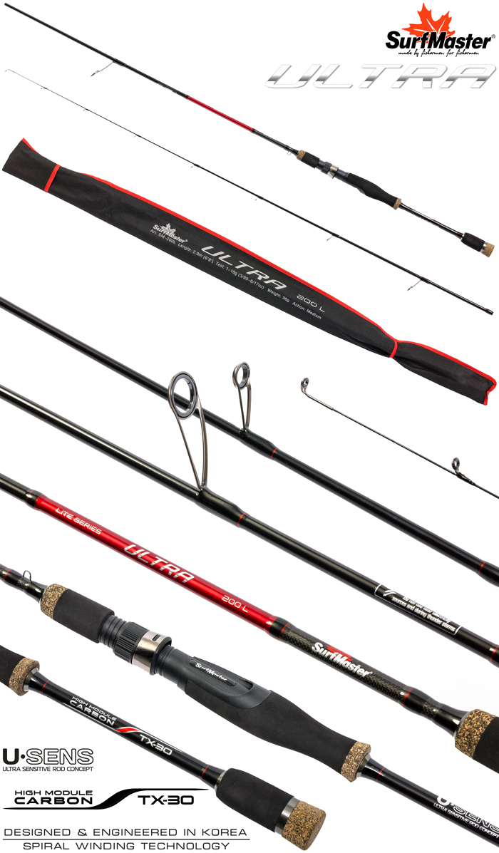 Surf Master Ultra L - спиннинг штекерный угольный (2 - ух составной). Новинка 2019 года. Быстрый строй спиннинга и вклеенная вершинка позволяют производить точные и дальние забросы минимальных по весу приманок, а также их анимировать и отслеживать самые осторожные поклевки. Благодаря использованию графита японского концерна Toray TX-30 (40-ton) и инновационным технологиям плетения бланка спиннинг обладает повышенной чувствительностью при проводке, что делает его незаменимым при контактных видах ловли: джиг, твич, ловля на техасскую оснастку и с отводным поводком. При производстве бланка спиннинга использована технология UPIT. Расстановка колец произведена по технологии New Guide System, позволяющая оптимально расположить кольца на бланке, определить их количество и размер (вес). Облегчённые кольца Kujira XR Long Super Hard ZrO2 (1600-1800H, kg/mm2).