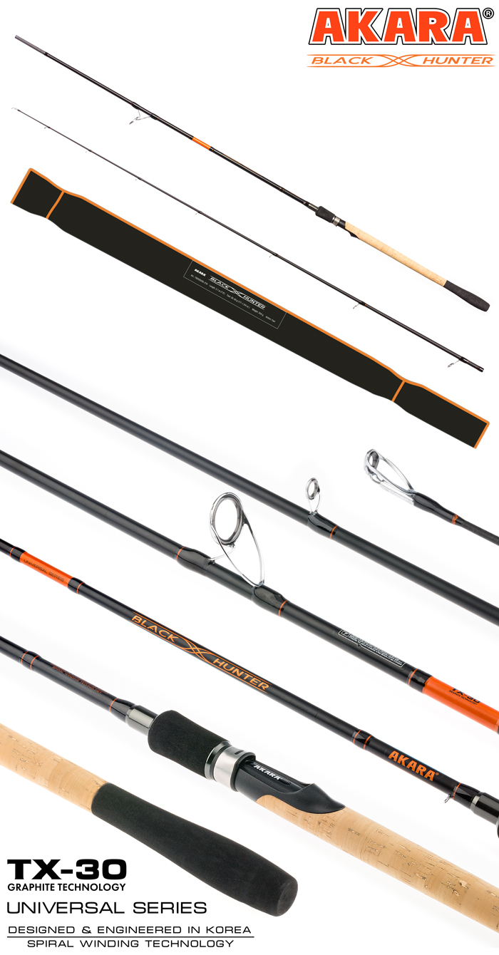 Новая линейка бюджетных спиннингов Akara Black Hunter. Несмотря на сравнительно небольшую цену, удилище получилось очень достойным. И самое главное, у нас наконец появилась длина 3 метра, что особенно востребовано у любителей береговой ловли. Эти длины есть в самых больших тестах 24-65 и 28-80 грамм.