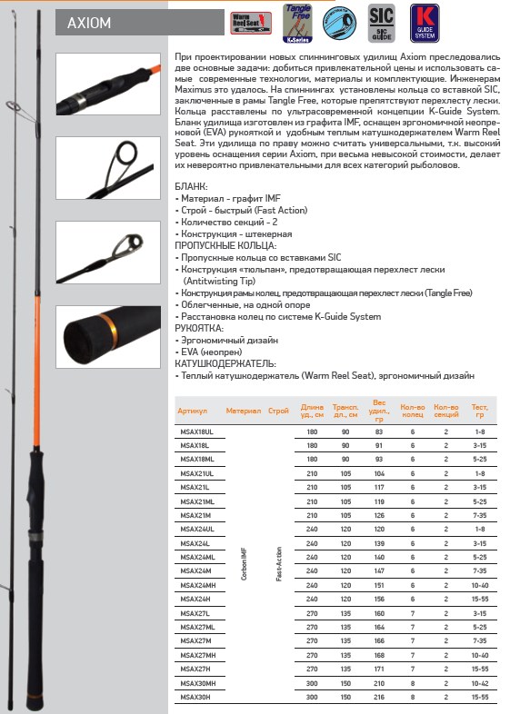 При проектировании спиннинговых удилищ Maximus Axiom преследовались две основные задачи: добиться привлекательной цены и использовать самые современные технологии, материалы и комплектующие. На спиннингах установлены кольца со вставкой SIC, заключенные в рамы Tangle Free, которые препятствуют перехлесту лески. Кольца расставлены по ультрасовременной концепции K-Guide System. Бланк удилища изготовлен из графита IMF, оснащен эргономичной неопреновой (EVA) рукояткой и удобным теплым катушкодержателем Warm Reel Seat. Эти удилища по праву можно считать универсальными, т.к. высокий уровень оснащения серии Axiom, при весьма невысокой стоимости, делает их невероятно привлекательными для всех категорий рыболовов. Бланк: Материал - графит IMF. Строй - быстрый (Fast Action). Пропускные кольца: Пропускные кольца со вставками SIC. К-Guide форма оправы. Конструкция тюльпан», предотвращающая перехлест лески (Antitwisting Tip). Конструкция рамы колец, предотвращающая перехлест лески (Tangle Free). Облегченные, на одной опоре. Расстановка колец по системе K-Guide System. Рукоятка: Эргономичный дизайн. EVA (неопрен). Катушкодержатель: Теплый катушкодержатель (Warm Reel Seat), эргономичный дизайн.