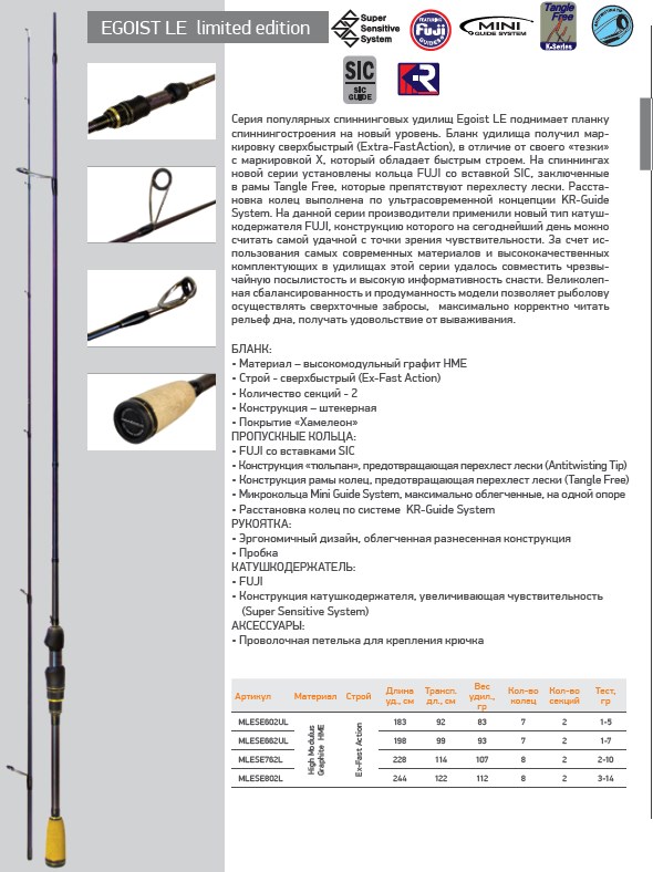 Cерия популярных спиннинговых удилищ Maximus Egoist LE поднимает планку спиннингостроения на новый уровень. Бланк удилища получил маркировку сверхбыстрый (Extra-FastAction), в отличие от своего тезки» с маркировкой X, который обладает быстрым строем. На спиннингах серии установлены кольца FUJI со вставкой SIC, заключенные в рамы Tangle Free, которые препятствуют перехлесту лески. Расстановка колец выполнена по ультрасовременной концепции KR-Guide System. На данной серии производители применили новый тип катушкодержателя FUJI, конструкцию которого на сегодняшний день можно считать самой удачной с точки зрения чув-ствительности. За счет использования самых современных материалов и высококачественных комплектующих в удилищах этой серии удалось совместить чрезвычайную посылистость и высокую информативность снасти. Великолепная сбалансированность и продуманность модели позволяет рыболову осуществлять сверхточные забросы, максимально корректно читать рельеф дна, получать удовольствие от вываживания. Бланк: Материал – высокомодульный графит HME. Строй - сверхбыстрый (Ex-Fast Action). Пропускные кольца: FUJI со вставками SIC. К-Guide форма оправы. Конструкция тюльпан», предотвращающая перехлест лески (Antitwisting Tip). Конструкция рамы колец, предотвращающая перехлест лески (Tangle Free). Микрокольца Mini Guide System, максимально облегченные, на одной опоре. Расстановка колец по системе KR-Guide System. Рукоятка: Эргономичный дизайн, облегченная разнесенная конструкция. Пробка. Катушкодержатель: FUJI. Конструкция катушкодержателя, увеличивающая чувствительность (Super Sensitive System).