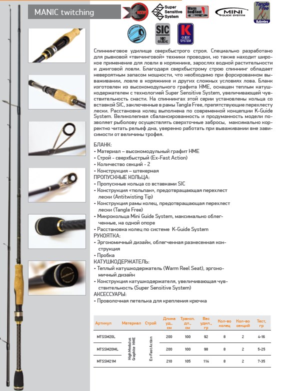 Спиннинговое удилище сверхбыстрого строя. Специально разработано для рывковой твичинговой» техники проводки, но также находит широкое применение для ловли в коряжнике, зарослях водной растительности и джиговой ловли. Благодаря сверхбыстрому строю спиннинг Maximus Manic обладает невероятным запасом мощности, что необходимо при форсированном вываживании, ловле в коряжнике и других сложных условиях лова. Бланк изготовлен из высокомодульного графита HME, оснащен теплым катушкодержателем с технологией Super Sensitive System, увеличивающей чувствительность снасти. На спиннингах этой серии установлены кольца со вставкой SIC, заключенные в рамы Tangle Free, препятствующие перехлесту лески. Расстановка колец выполнена по современной концепции K-Guide System. Великолепная сбалансированность и продуманность модели позволяет рыболову осуществлять сверхточные забросы, м аксимально кор¬ректно читать рельеф дна, уверенно работать при вываживании вне зависимости от величины трофея. Бланк: Материал – высокомодульный графит HME. Строй - сверхбыстрый (Ex-Fast Action). Пропускные кольца: Пропускные кольца со вставками SI. К-Guide форма оправы. Конструкция тюльпан», предотвращающая перехлест лески (Antitwisting Tip). Конструкция рамы колец, предотвращающая перехлест лески (Tangle Free). Микрокольца Mini Guide System, максимально облегченные, на одной опоре. Расстановка колец по системе K-Guide System. Рукоятка: Эргономичный дизайн, облегченная разнесенная конструкция. Пробка. Катушкодержатель: Теплый катушкодержатель (Warm Reel Seat), эргономичный дизайн. Конструкция катушкодержателя, увеличивающая чувствительность (Super Sensitive System).