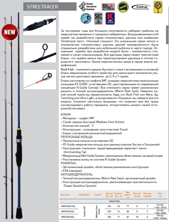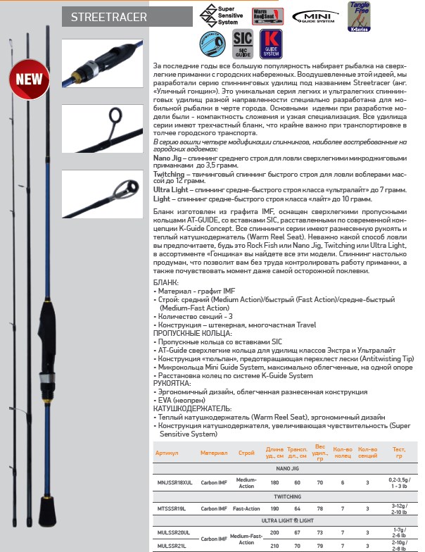 За последние годы все большую популярность набирает рыбалка на сверхлегкие приманки с городских набережных. Воодушевленные этой идеей, мы разработали серию спиннинговых удилищ под названием Streetracer (анг. Уличный гонщик»). Это уникальная серия легких и ультралегких спиннинговых удилищ разной направленности специально разработана для мобильной рыбалки в черте города. Основными идеями при разработке модели были - компактность сложения и узкая специализация. Все удилища серии имеют трехчастный бланк, что крайне важно при транспортировке в толчее городского транспорта. В серию вошли четыре модификации спиннингов, наиболее востребованные на городских водоемах: Nano Jig – спиннинг среднего строя для ловли сверхлегкими микроджиговыми приманками до 3,5 грамм. Twitching – твичинговый спиннинг быстрого строя для ловли воблерами массой до 12 грамм. Ultra Light – спиннинг средне-быстрого строя класса ультралайт» до 7 грамм. Light – спиннинг средне-быстрого строя класса лайт» до 10 грамм. Бланк изготовлен из графита IMF, оснащен сверхлегкими пропускными кольцами AT-GUIDE, со вставками SIC, расставленными по современной концепции K-Guide Concept. Все спиннинги серии имеют разнесенную рукоять и теплый катушкодержатель (Warm Reel Seat). Неважно какой способ ловли вы предпочитаете, будь это Rock Fish или Nano Jig, Twitching или Ultra Light, в ассортименте Гонщика» вы найдете все эти модели. Спиннинг настолько продуман, что позволит вам без труда контролировать работу приманки, а также почувствовать момент даже самой осторожной поклевки. Бланк: Материал - графит IMF. Строй - средний (Medium Action)/быстрый (Fast Action)/средне-быстрый (Medium-Fast Action). Количество секций - 3. Конструкция – штекерная, многочастная Travel. Пропускные кольца: Пропускные кольца cо вставками SIC. Конструкция тюльпан», предотвращающая перехлест лески (Antitwisting Tip). AT-Guide сверхлегкие кольца для удилищ классов Экстра и Ультралайт. Микрокольца Mini Guide System, максимально облегченные, на одной опоре. Расстановка колец по системе K-Guide System. Рукоятка: Эргономичный дизайн. Облегченная разнесенная конструкция. EVA (неопрен). Катушкодержатель: Теплый катушкодержатель (Warm Reel Seat). Эргономичный дизайн. Конструкция катушкодержателя, увеличивающая чувствительность (Super Sensitive System).