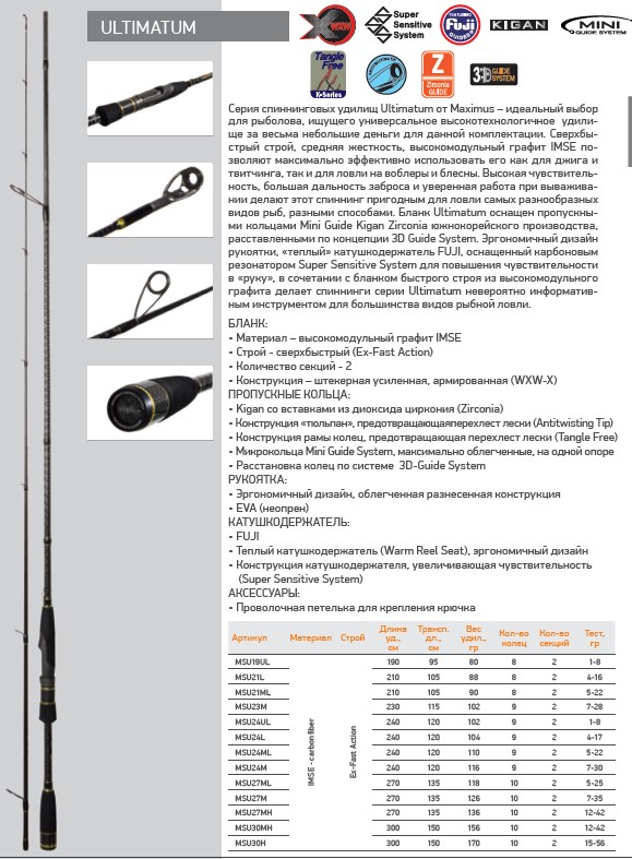 Новая серия спиннинговых удилищ Ultimatum от Maximus – идеальный выбор для рыболова, ищущего универсальное высокотехнологичное удилище за весьма небольшие деньги для данной комплектации. Сверхбыстрый строй, средняя жесткость, высокомодульный графит IMSE позволяют максимально эффективно использовать его как для джига и твитчинга, так и для ловли на воблеры и блесны. Высокая чувствительность, большая дальность заброса и уверенная работа при вываживании делают этот спиннинг пригодным для ловли самых разнообразных видов рыб, разными способами. Бланк Ultimatum оснащен пропускными кольцами Mini Guide Kigan Zirconia южнокорейского производства, расставленными по концепции 3D Guide System. Эргономичный дизайн рукоятки, теплый» катушкодержатель FUJI, оснащенный карбоновым резонатором Super Sensitive System для повышения чувствительности в руку», в сочетании с бланком быстрого строя из высокомодульного графита делает спиннинги серии Ultimatum невероятно информативным инструментом для большинства видов рыбной ловли.