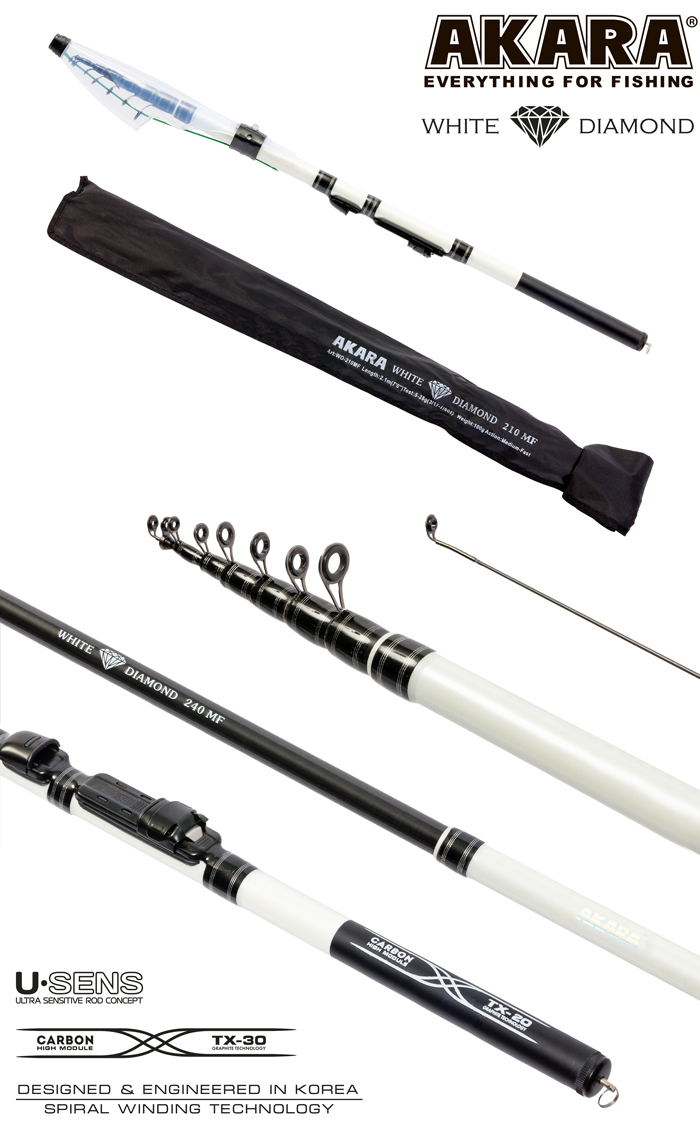 Akara White Diamond FM - спиннинг телескопический угольный. Отличается компактными размерами для удобной транспортировки. Благодаря использованию современных материалов - графит японского концерна Toray TX-30 (40-ton), обладает быстрым строем и хорошей чувствительностью. Быстрый строй спиннинга позволяет выполнять дальние и точные забросы. Комплектуется облегченными кольцами и катушкодержателем с механизмом быстрого крепления катушки.
