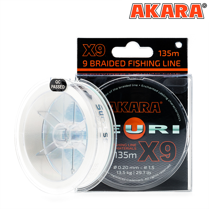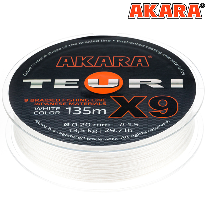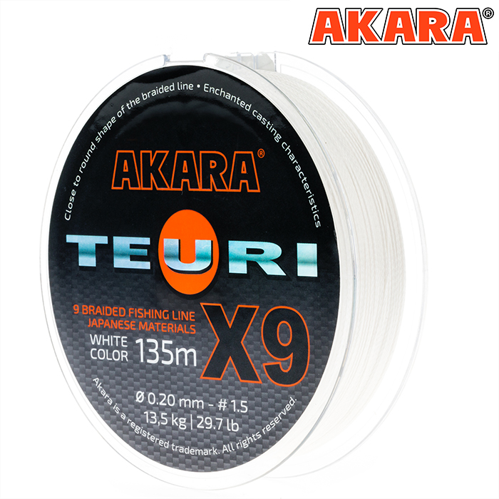 Akara Teuri X-9 135м - этот шнур сплетен из 9 нитей, по специальной технологии, благодаря чему, он получил более круглую форму. Шнур создан для того чтобы удовлетворить потребности рыболовов в качественном, надежном, прочном и недорогом шнуре. Рекомендован для ловли на джиг, дропшот, отводной, микро джиг, фидер, троллингом и для других видов рыбной ловли, где требуется четкий контроль приманки, качественный и прицельный заброс. Сплетен из нового современного волокна японского производства повышенной плотности. Отличается высокой прочностью и надежностью и подойдет практически для любых условий лова, в том числе для ловли в местах, где высока вероятность зацепов.